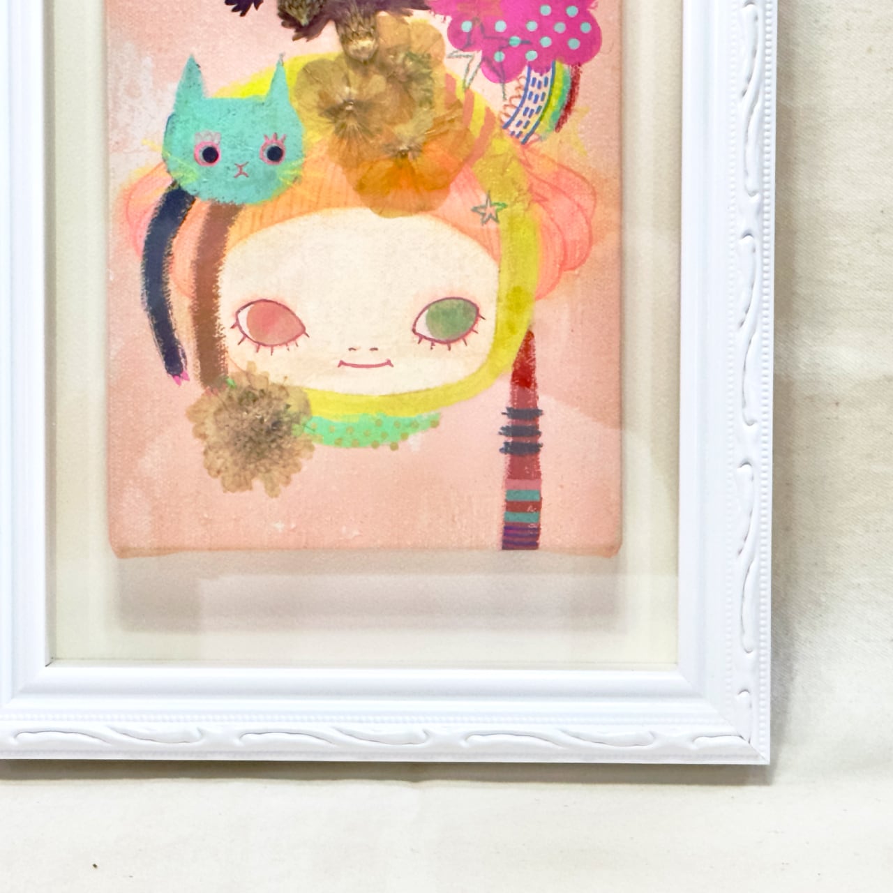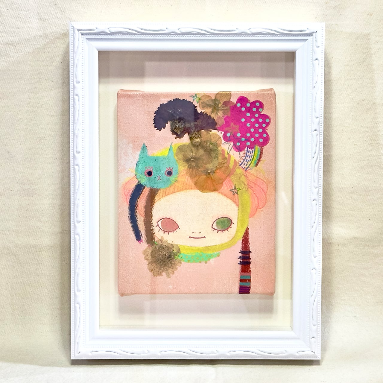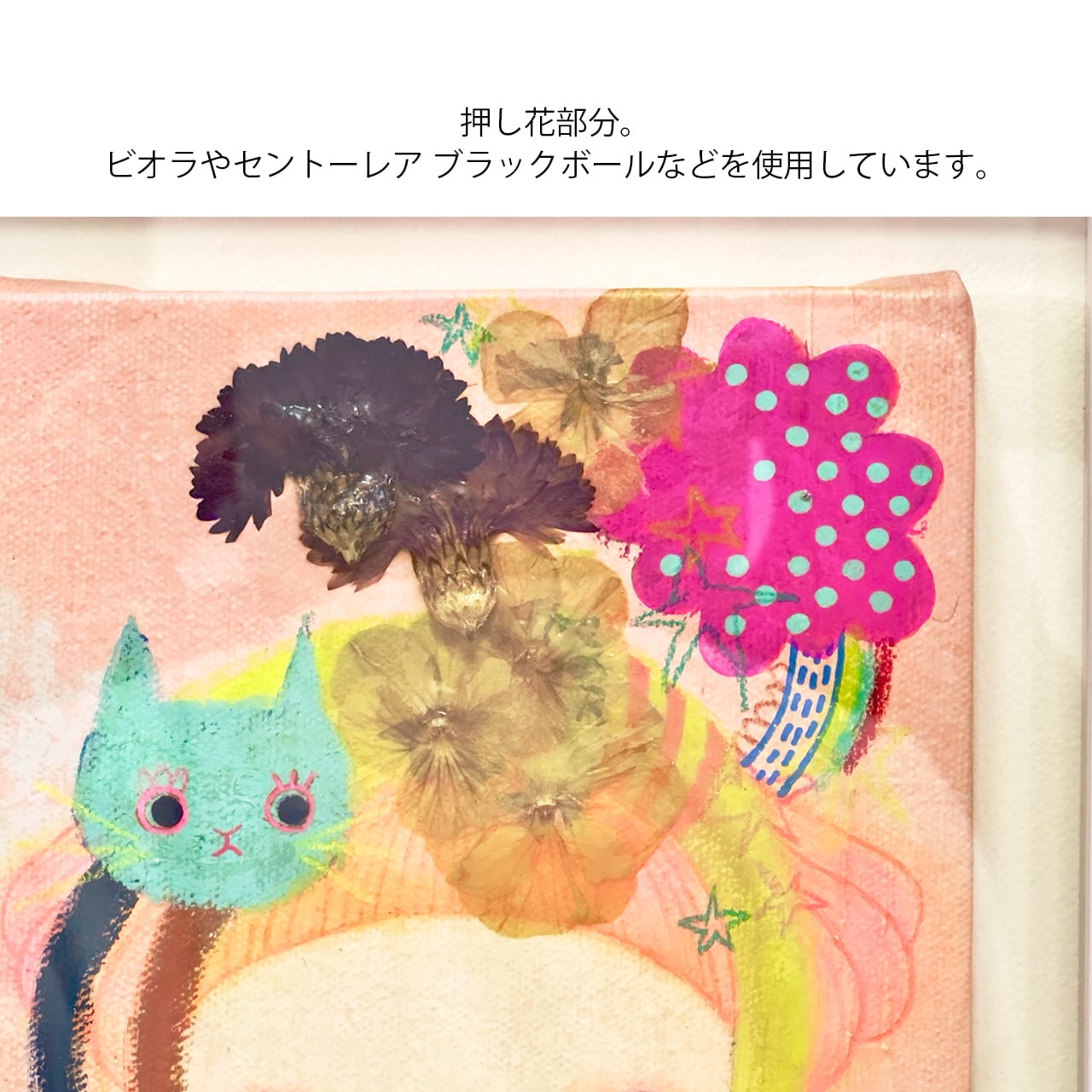 キャンバス、アクリルガッシュ、色鉛筆、押し花等