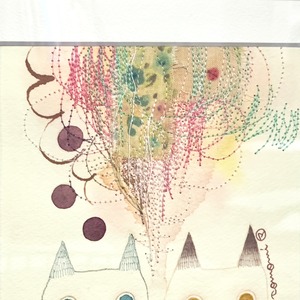 絵の上に、庭で育てた花を押し花にしてコラージュ、刺繍などを施した作品です。