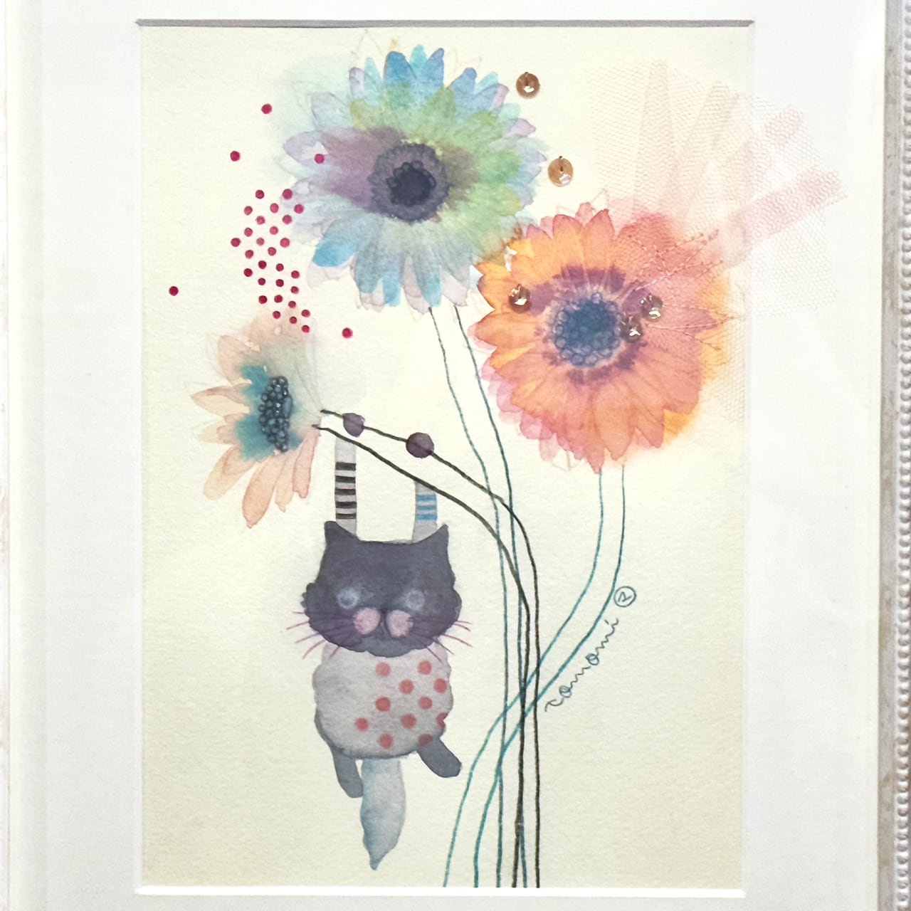 11月の誕生花アート水彩画「ガーベラとネコ。」(額入り)