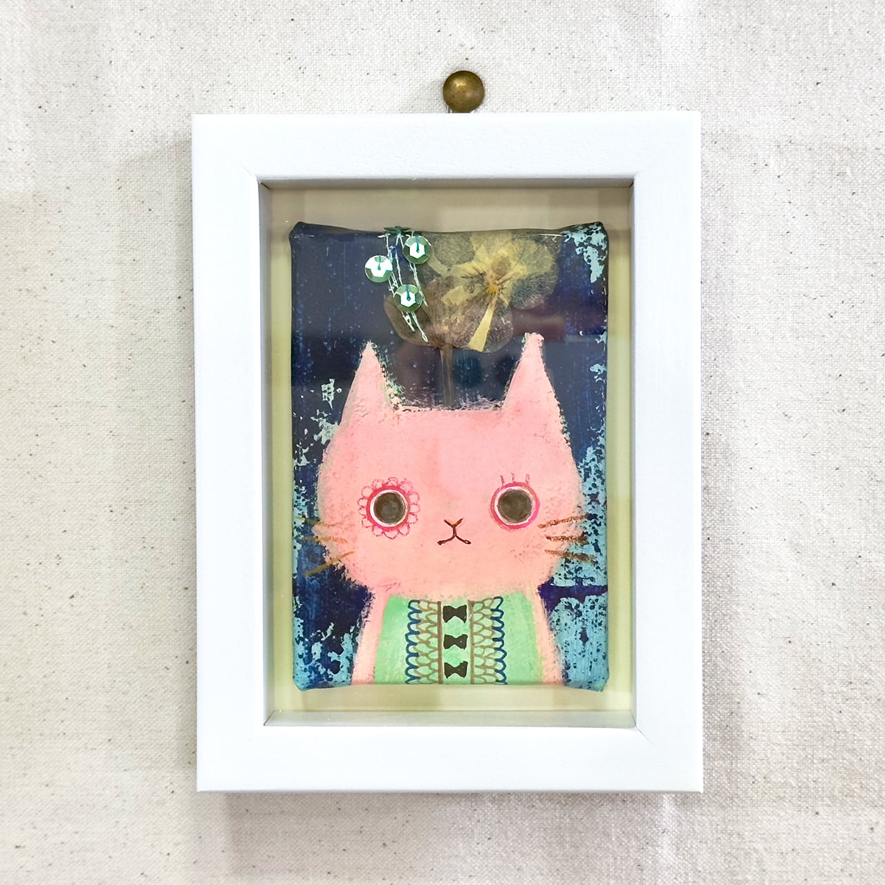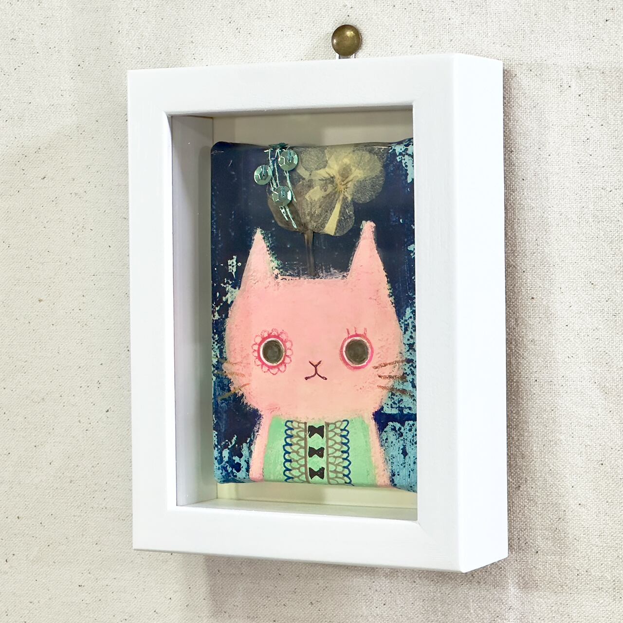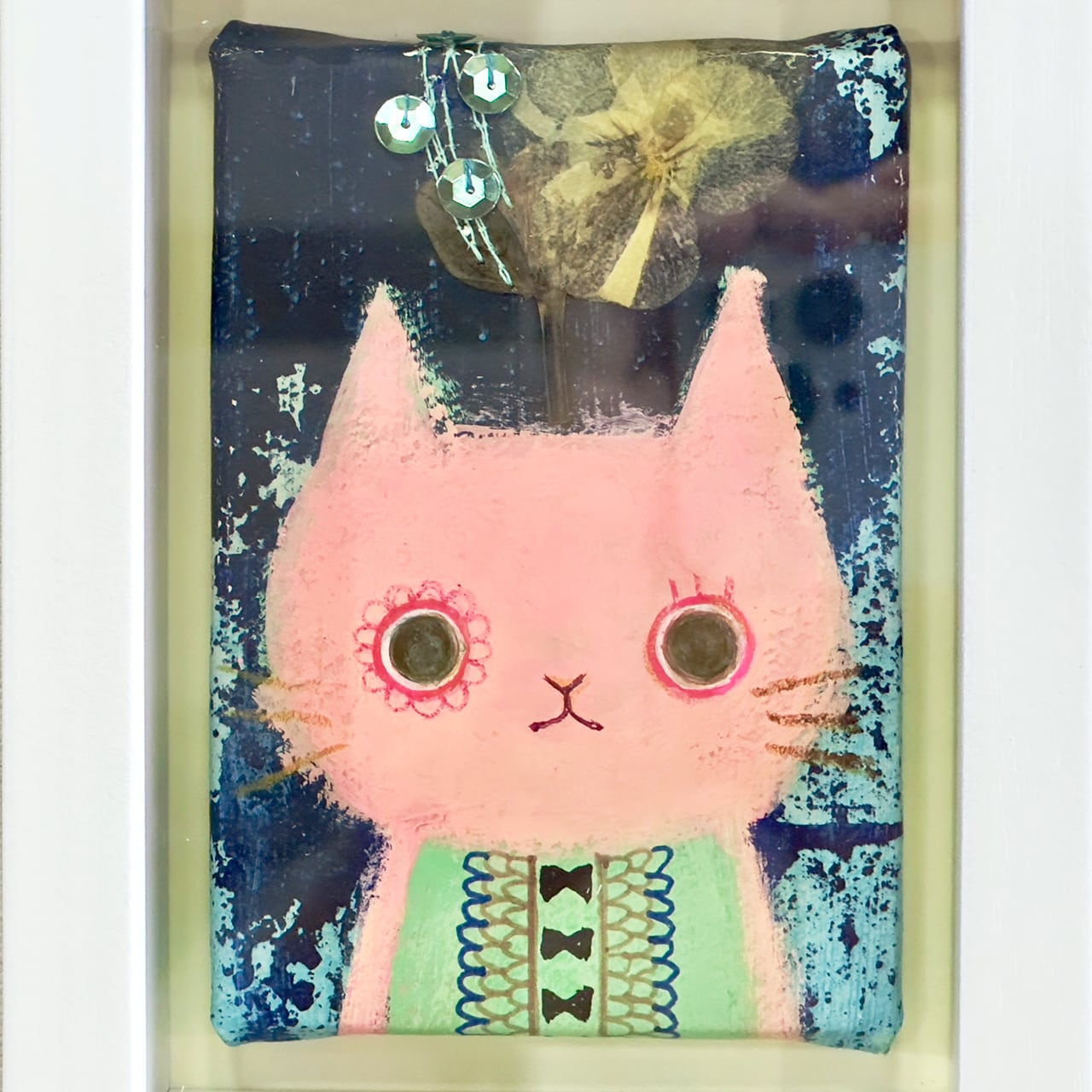 押し花アートアクリル画・ミニキャンバス「ピンクなネコ。」
