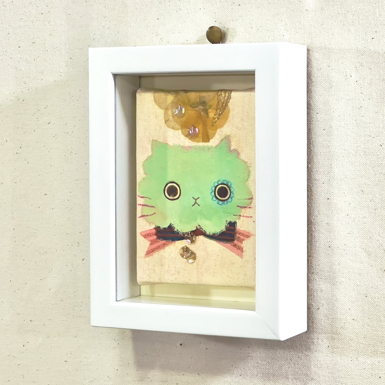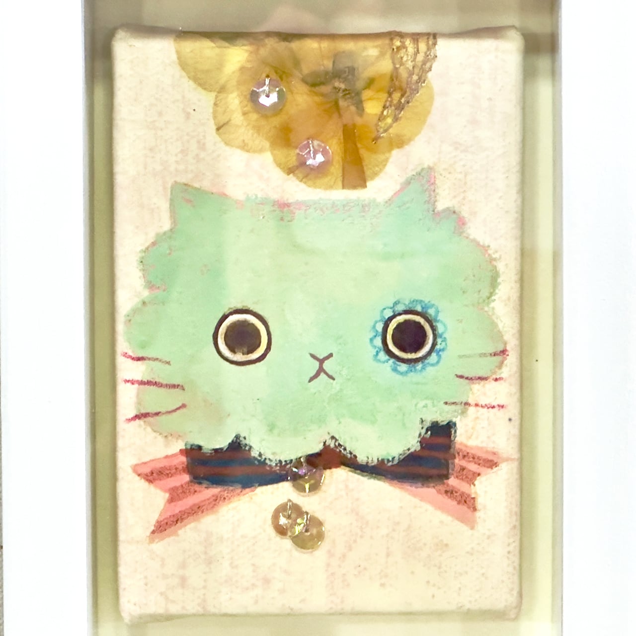 押し花アートアクリル画・ミニキャンバス「おめかしリボンネコ。」