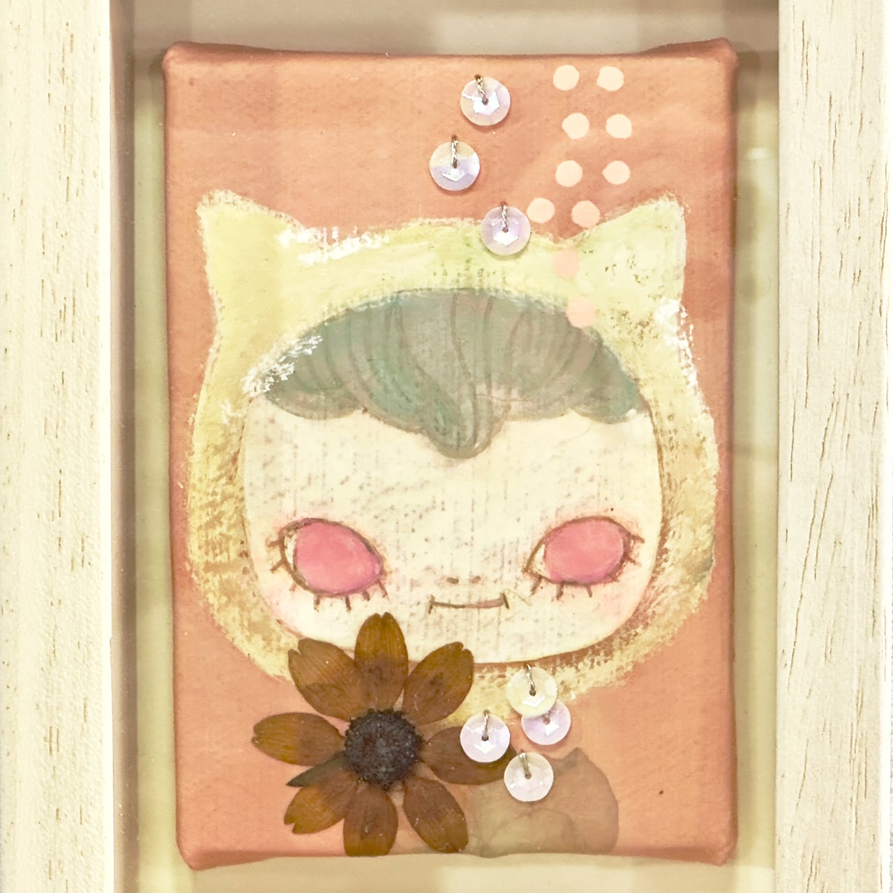 押し花アートアクリル画・ミニキャンバス「ネコっかぶりガール。」