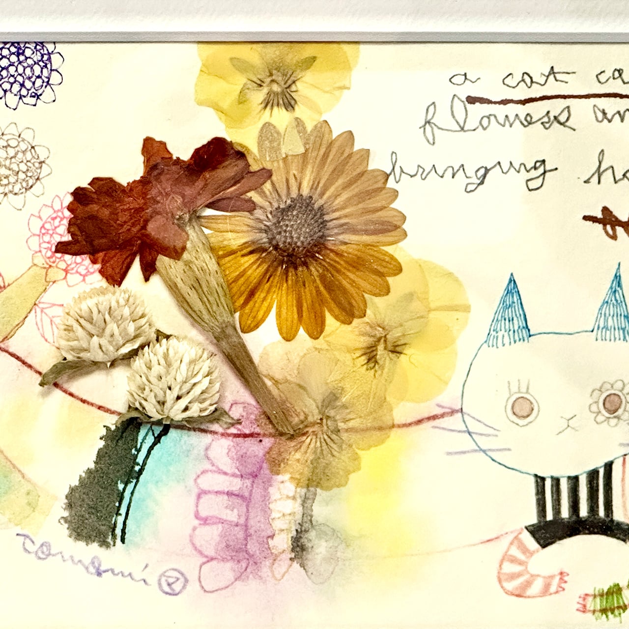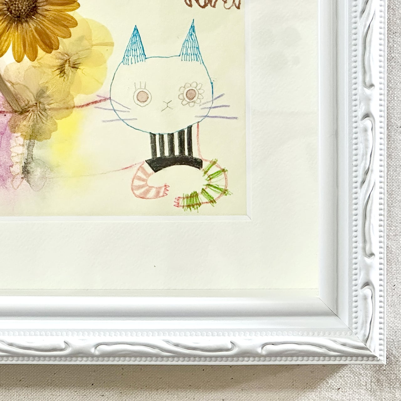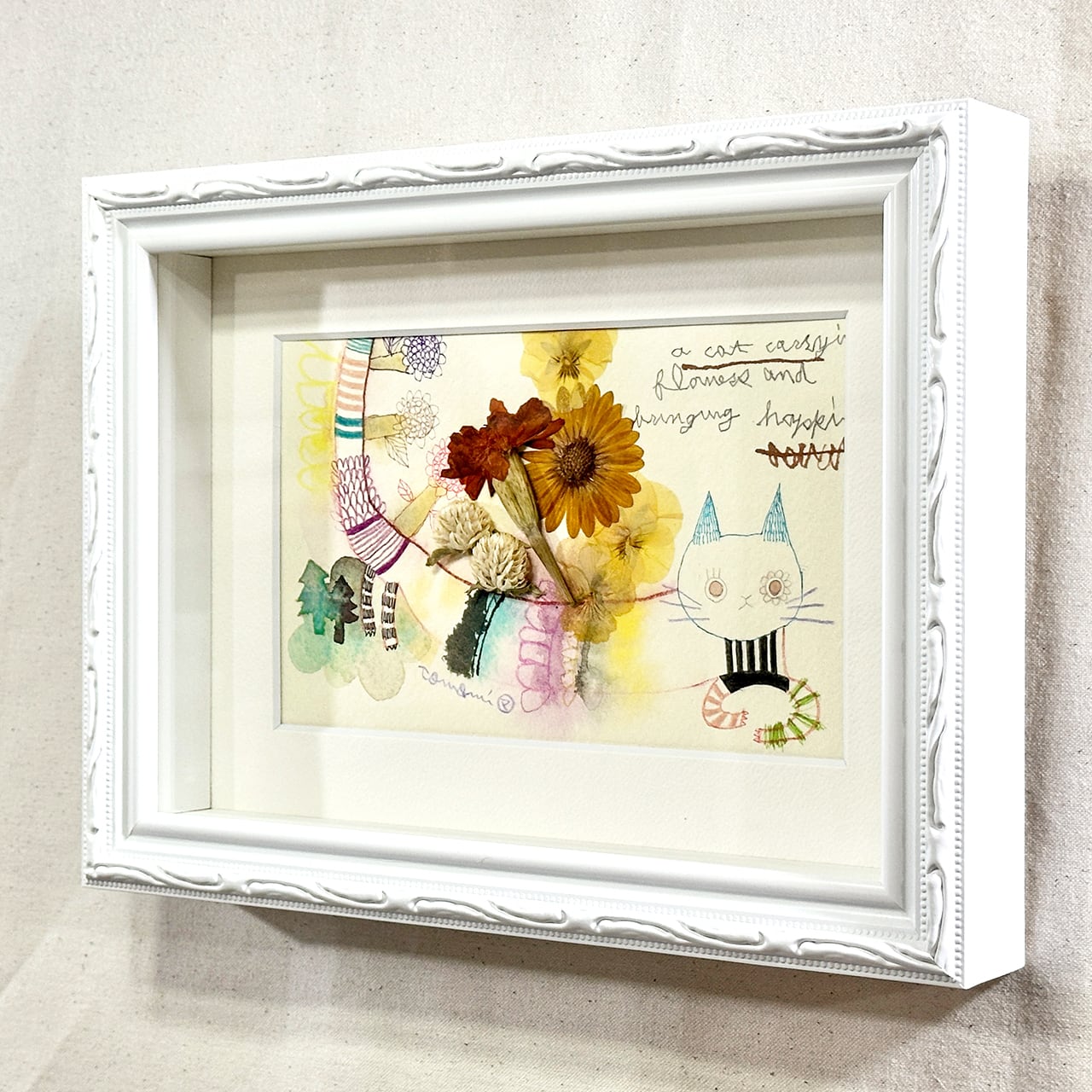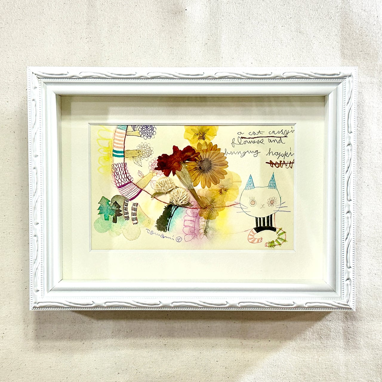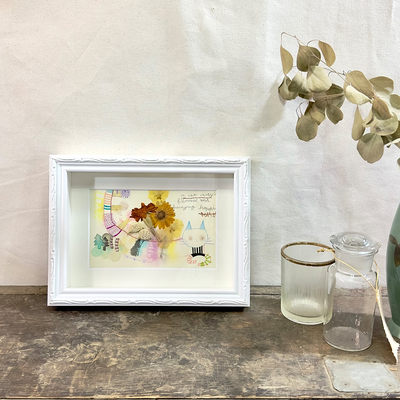 押し花アート水彩画「シアワセを運ぶネコ。」(額入り)