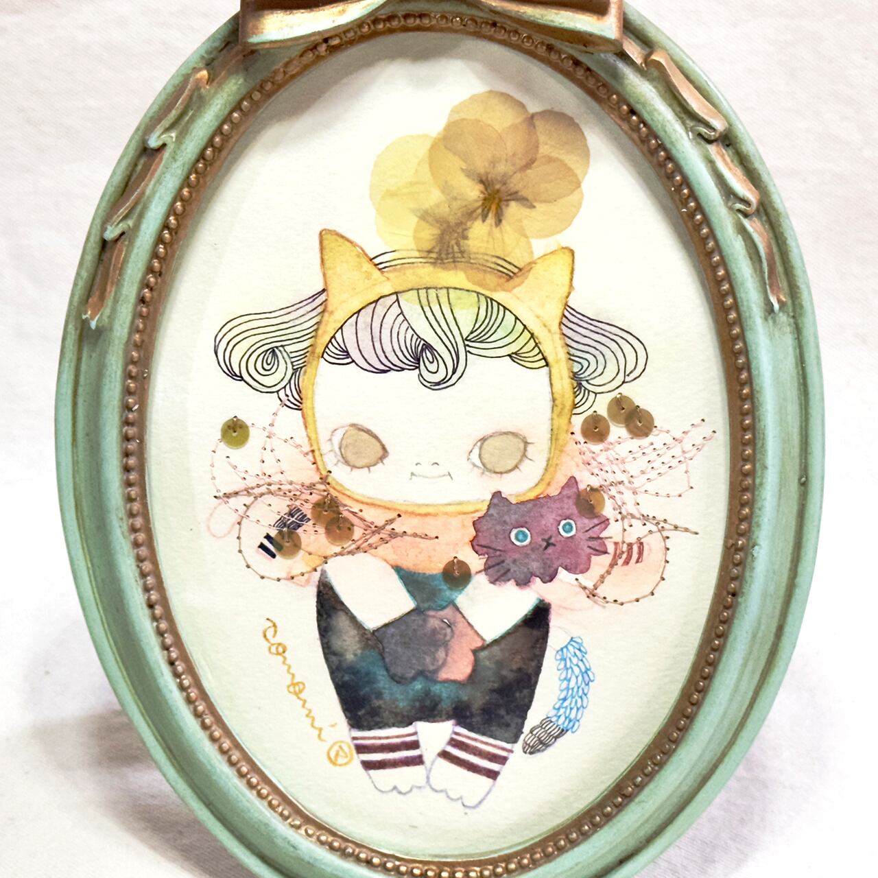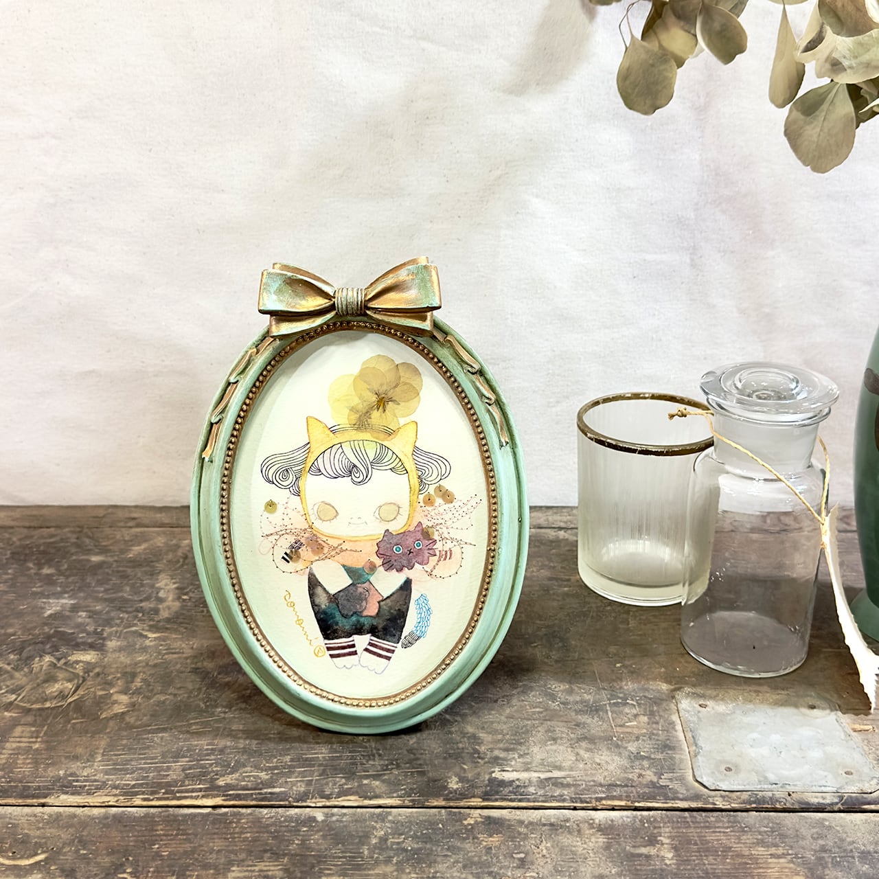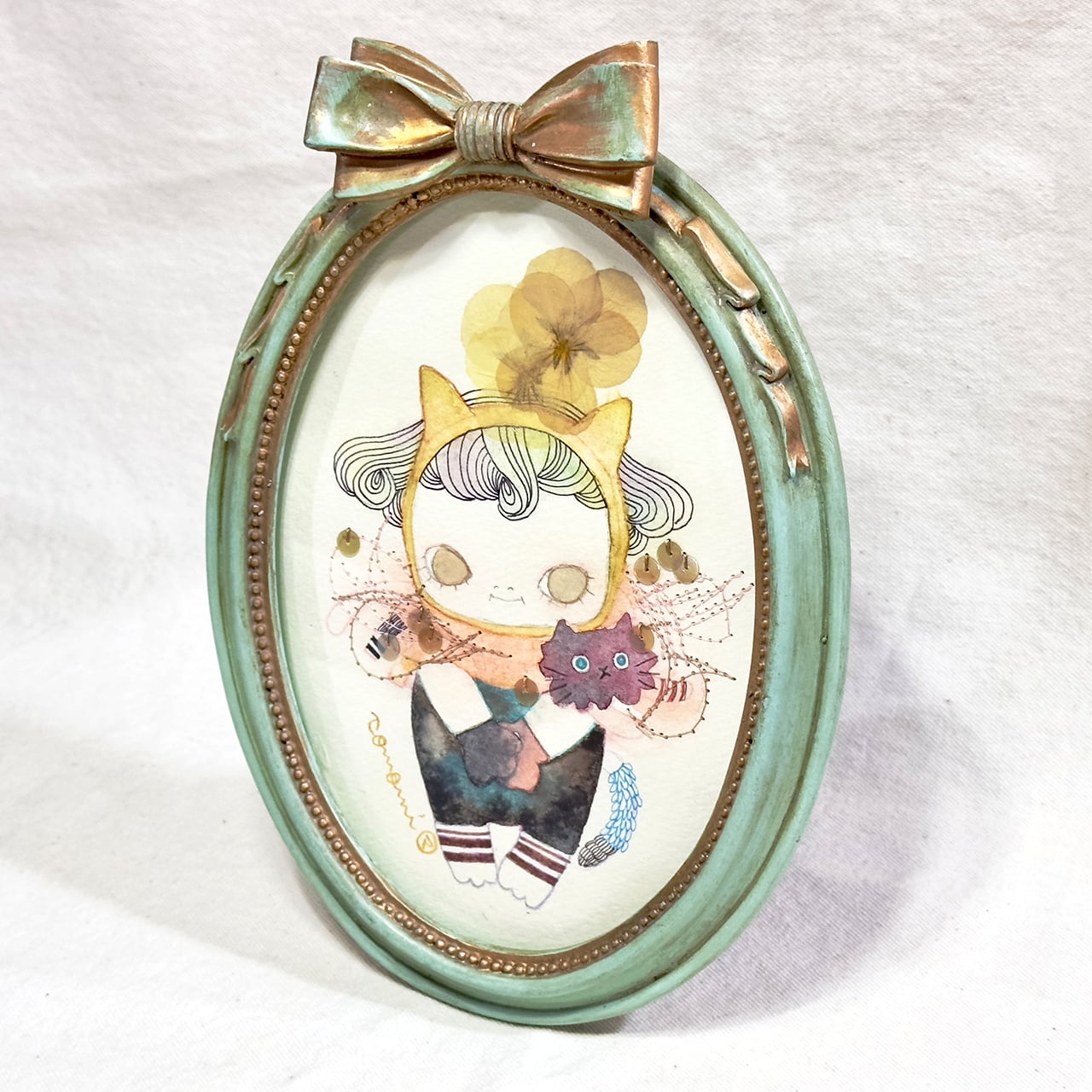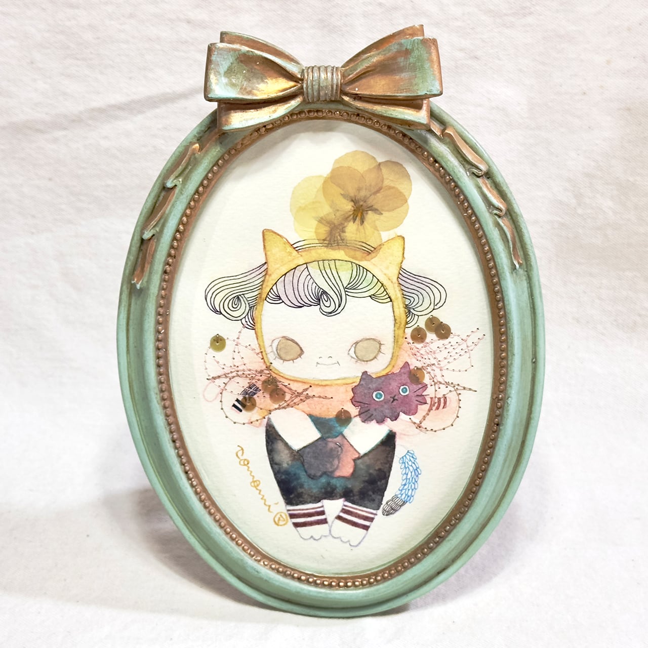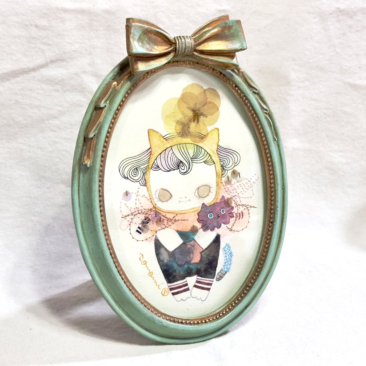 押し花アート水彩画「ネコマフラーガール。」(額入り)