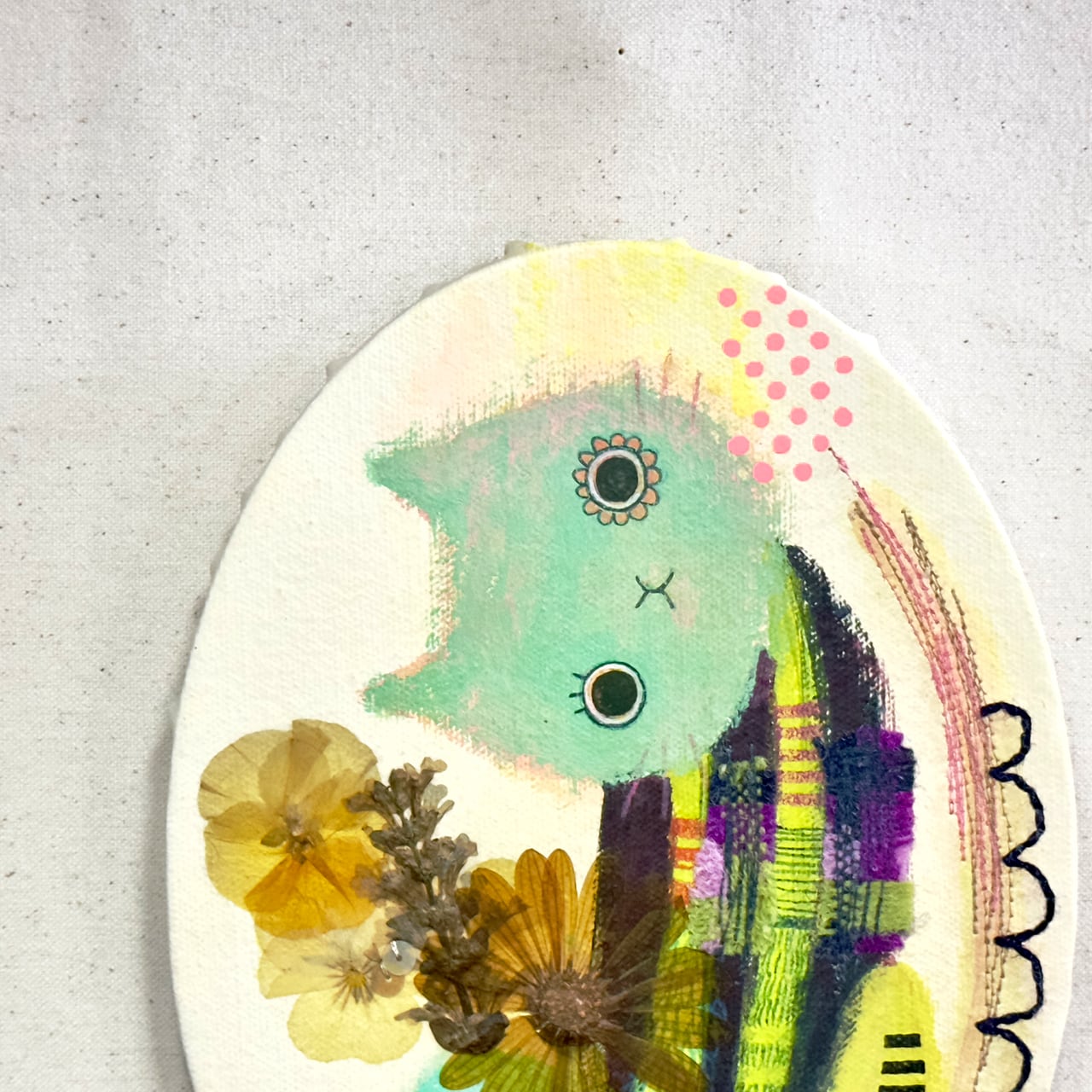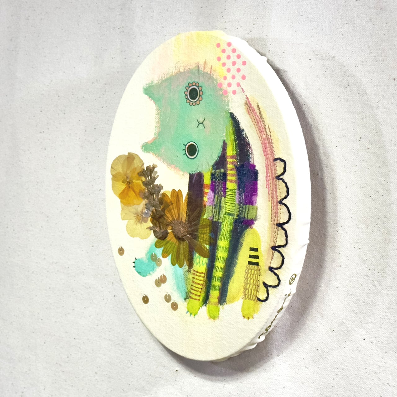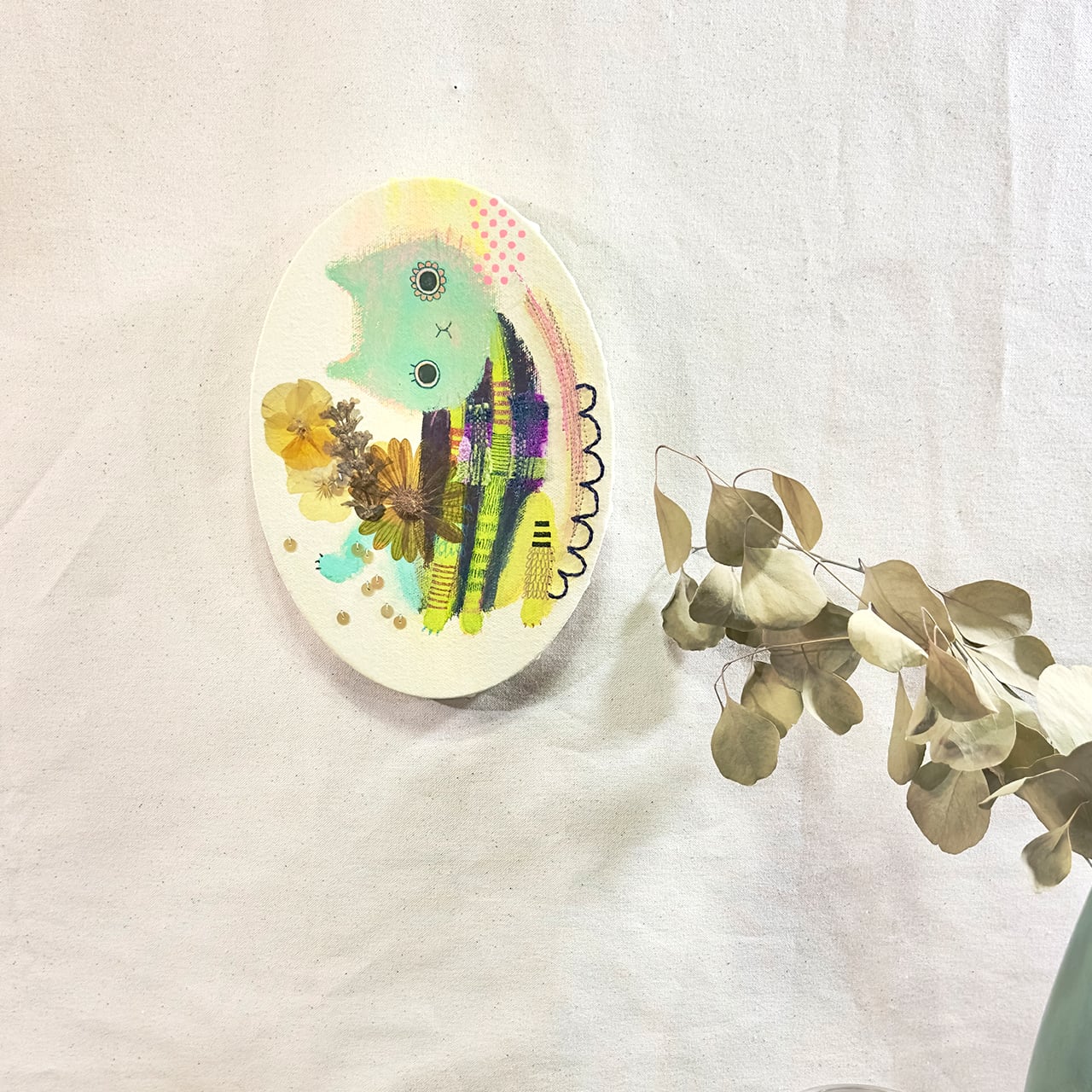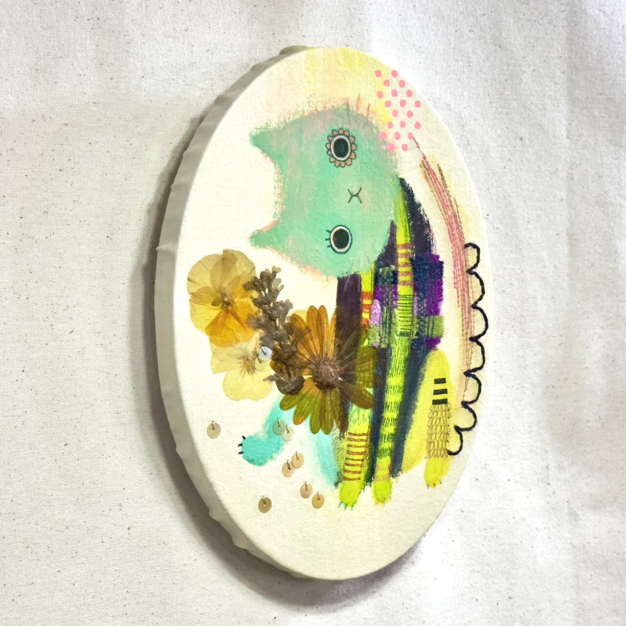 キャンバス、アクリルガッシュ、ペン、押し花、糸等