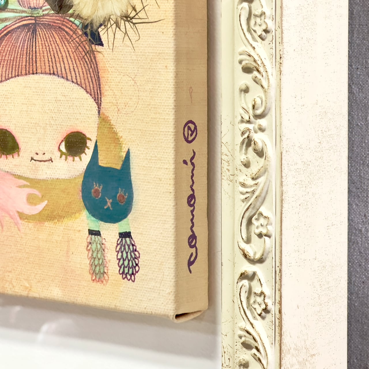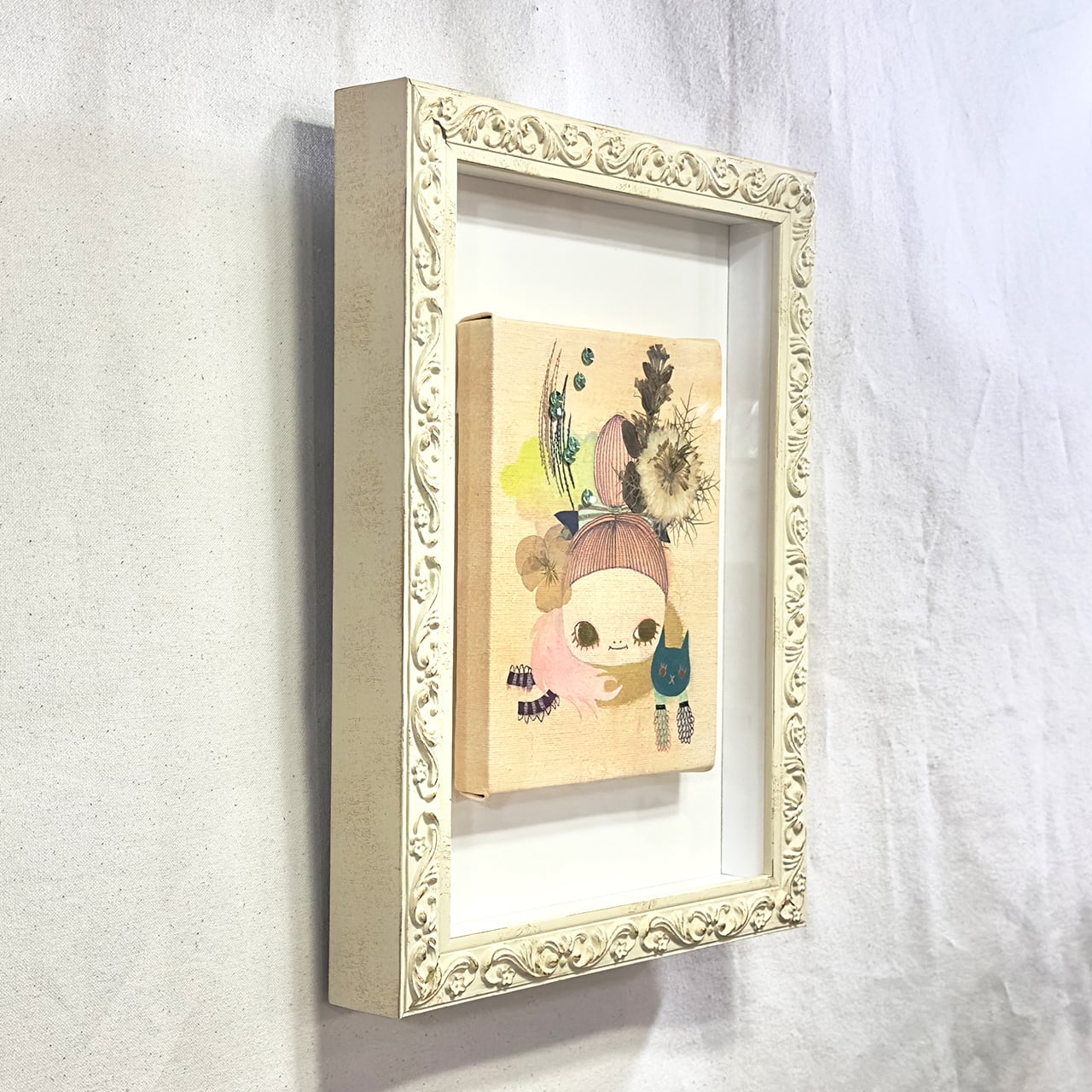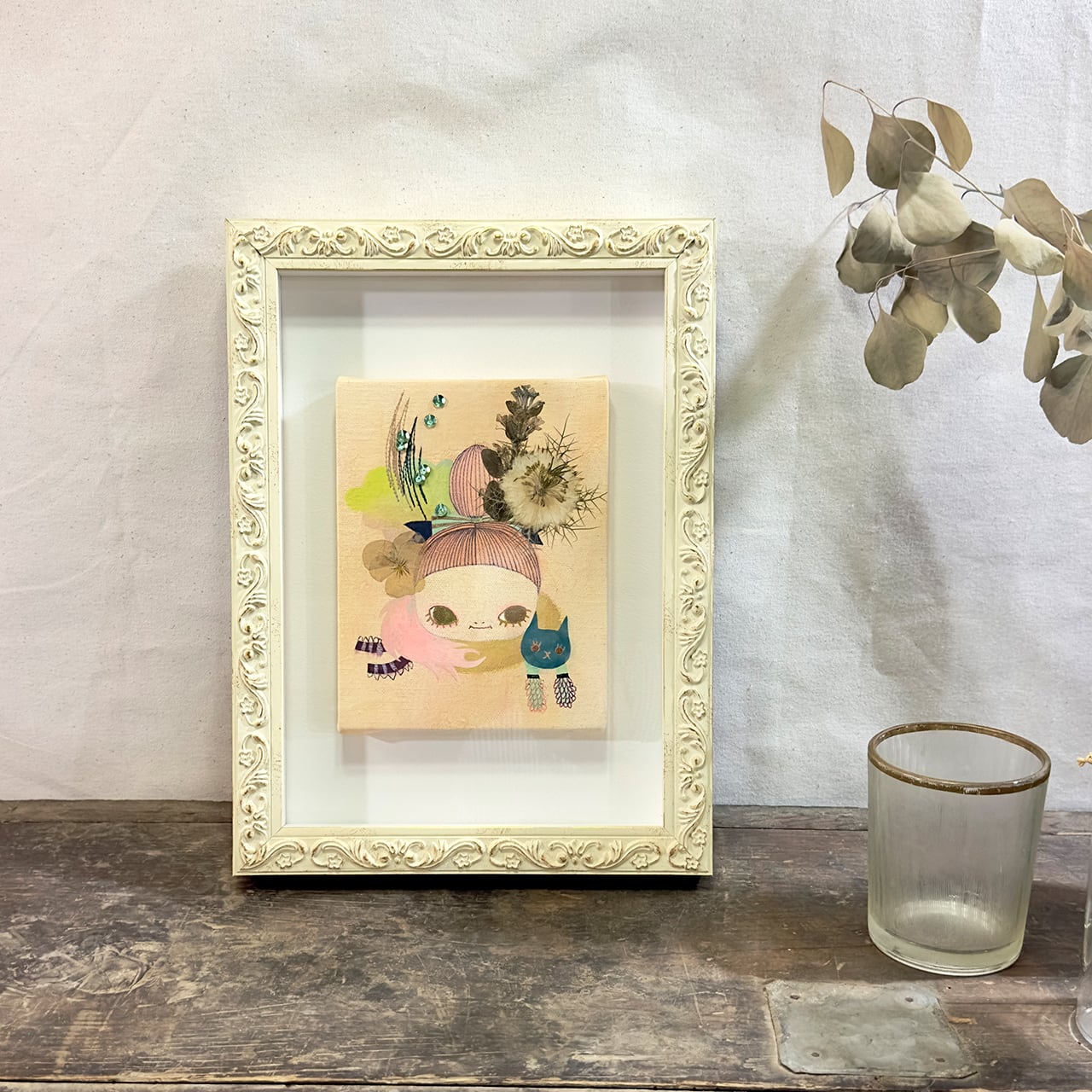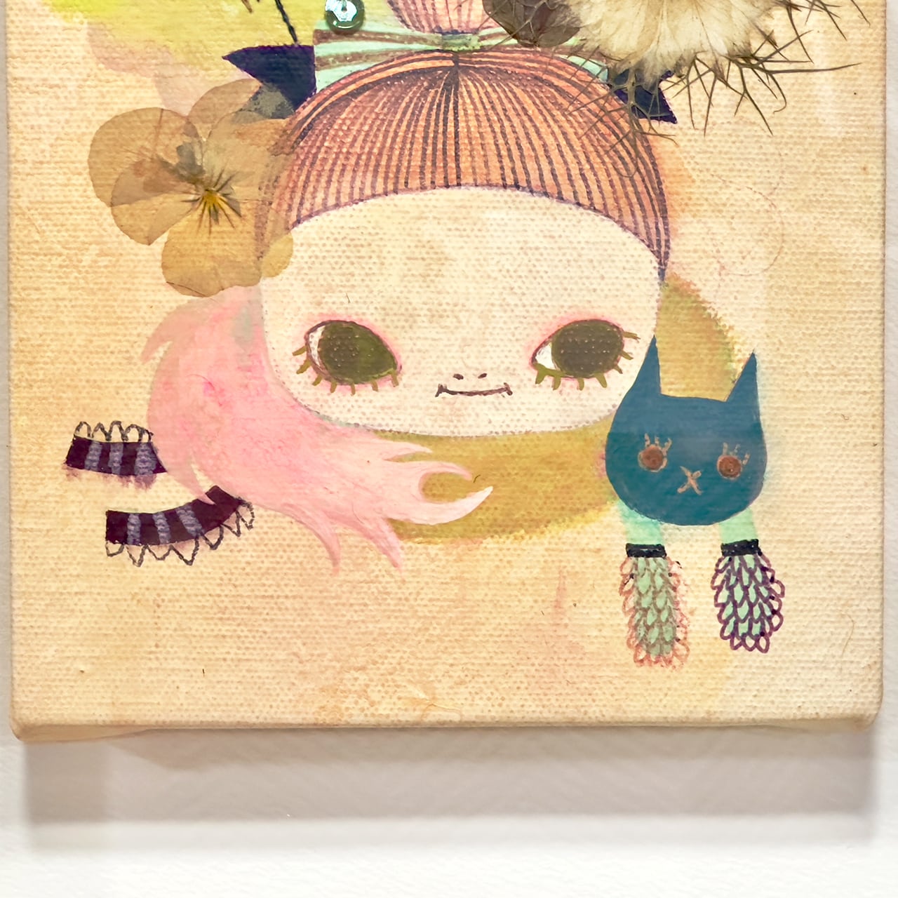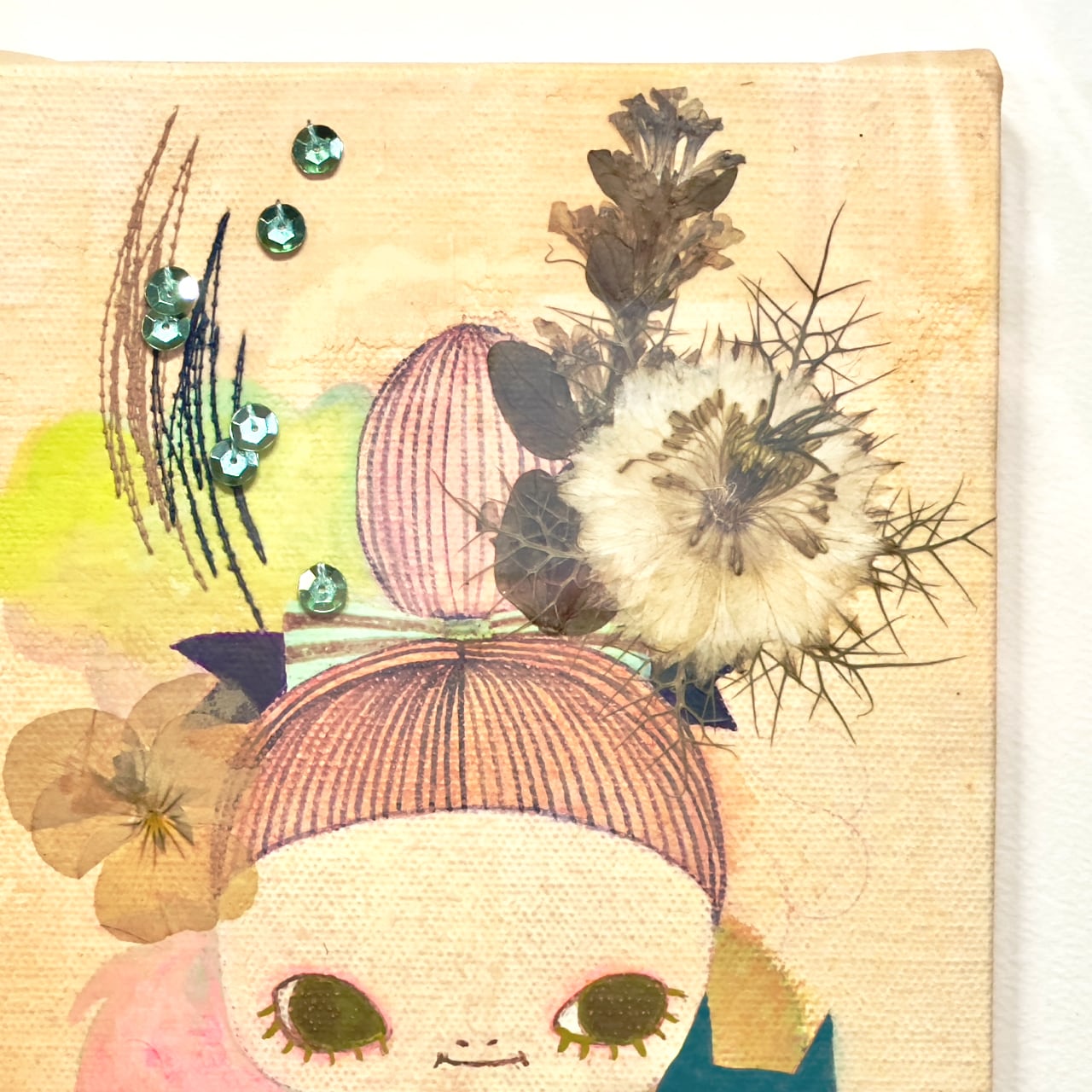 キャンバス、アクリルガッシュ、ペン、押し花、糸等