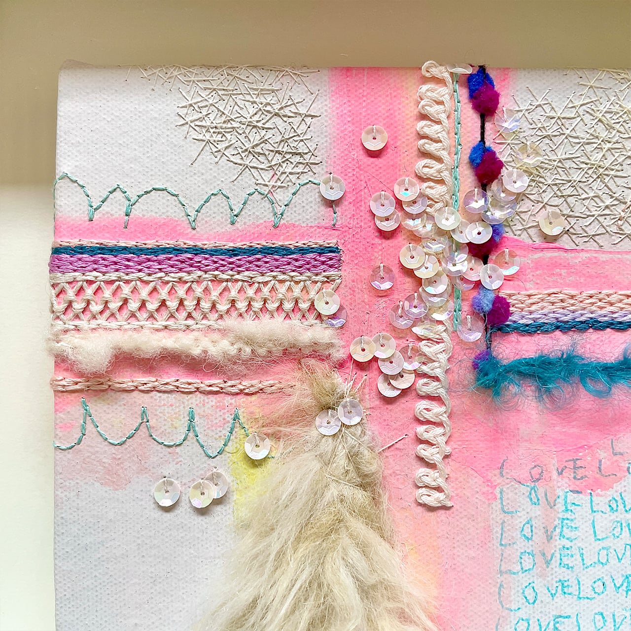 作品はペイントしたキャンバスの上に直接手刺繍をほどこしており、今回は今まで絵画の中の一部としていた刺繍を全面に押し出した作品に仕上げました。