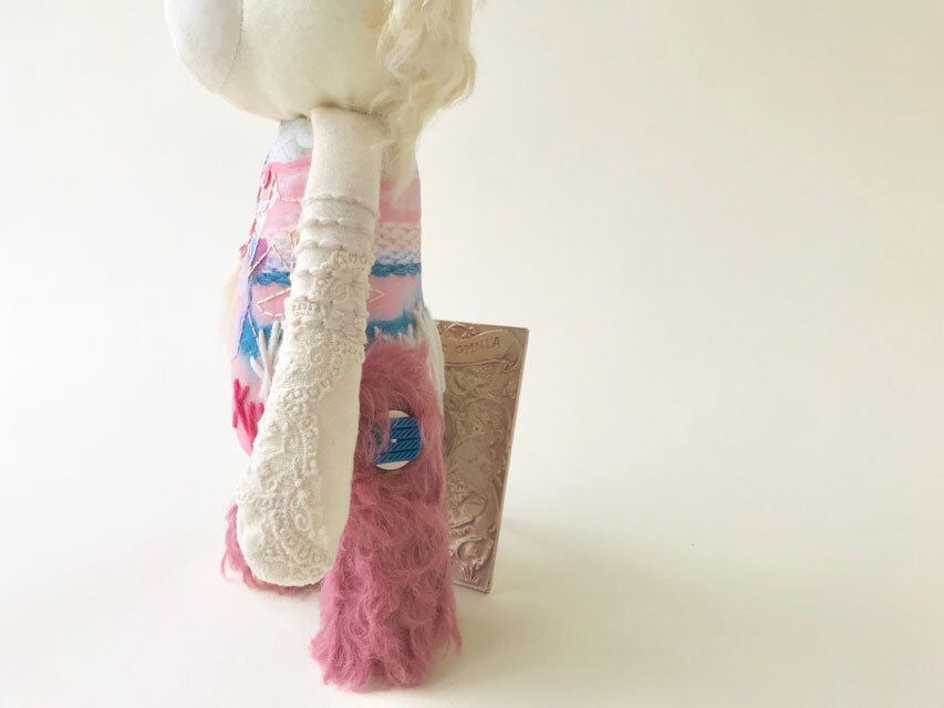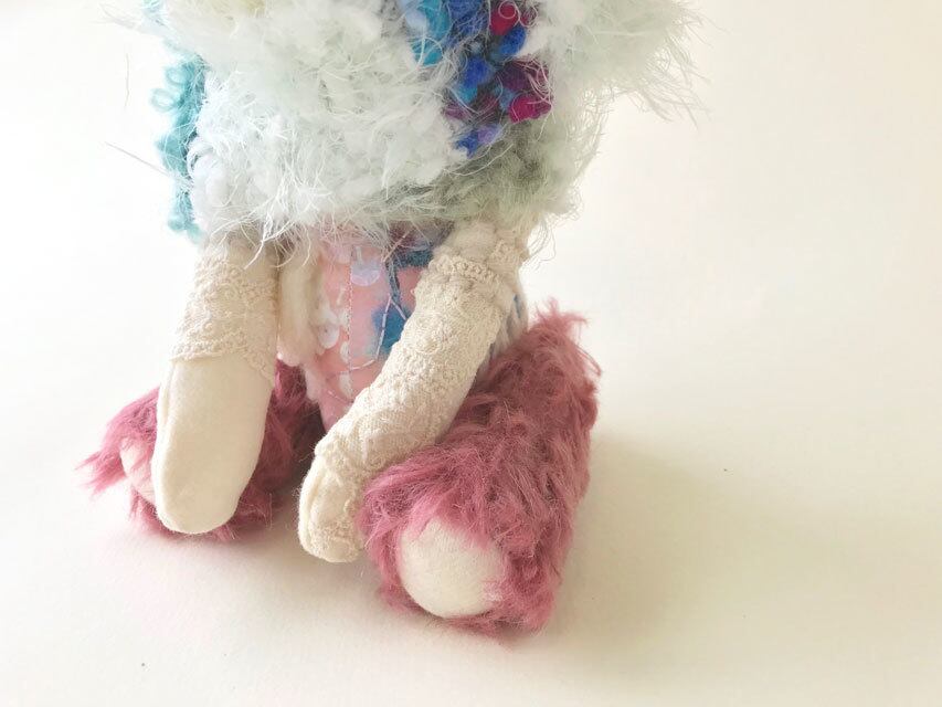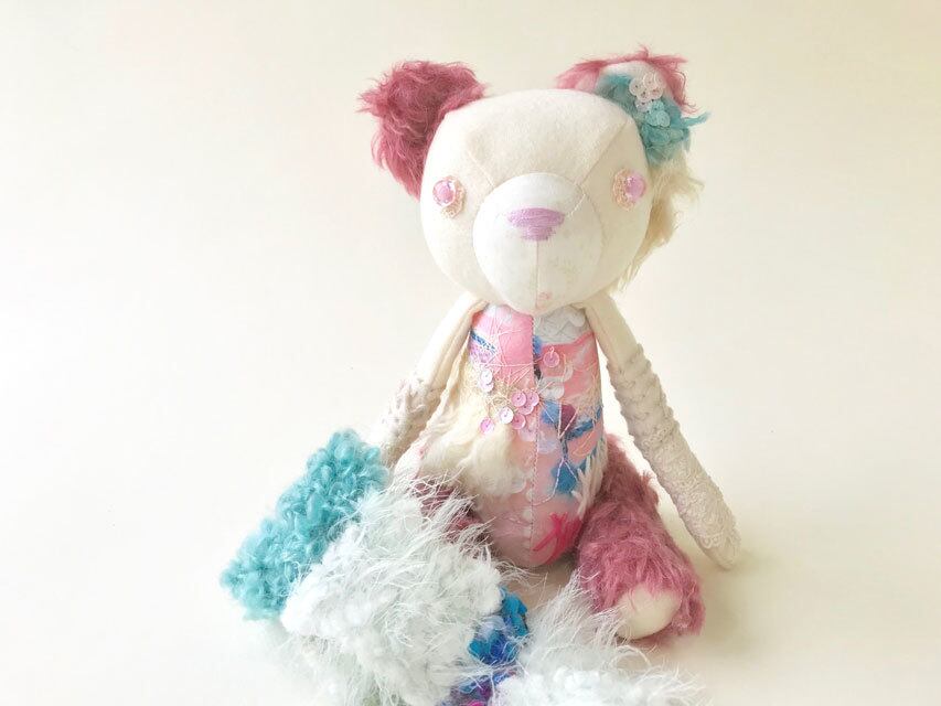 素材 綿生地、モヘア、刺繍糸、毛糸、グラスアイ、アンティークボタンなど