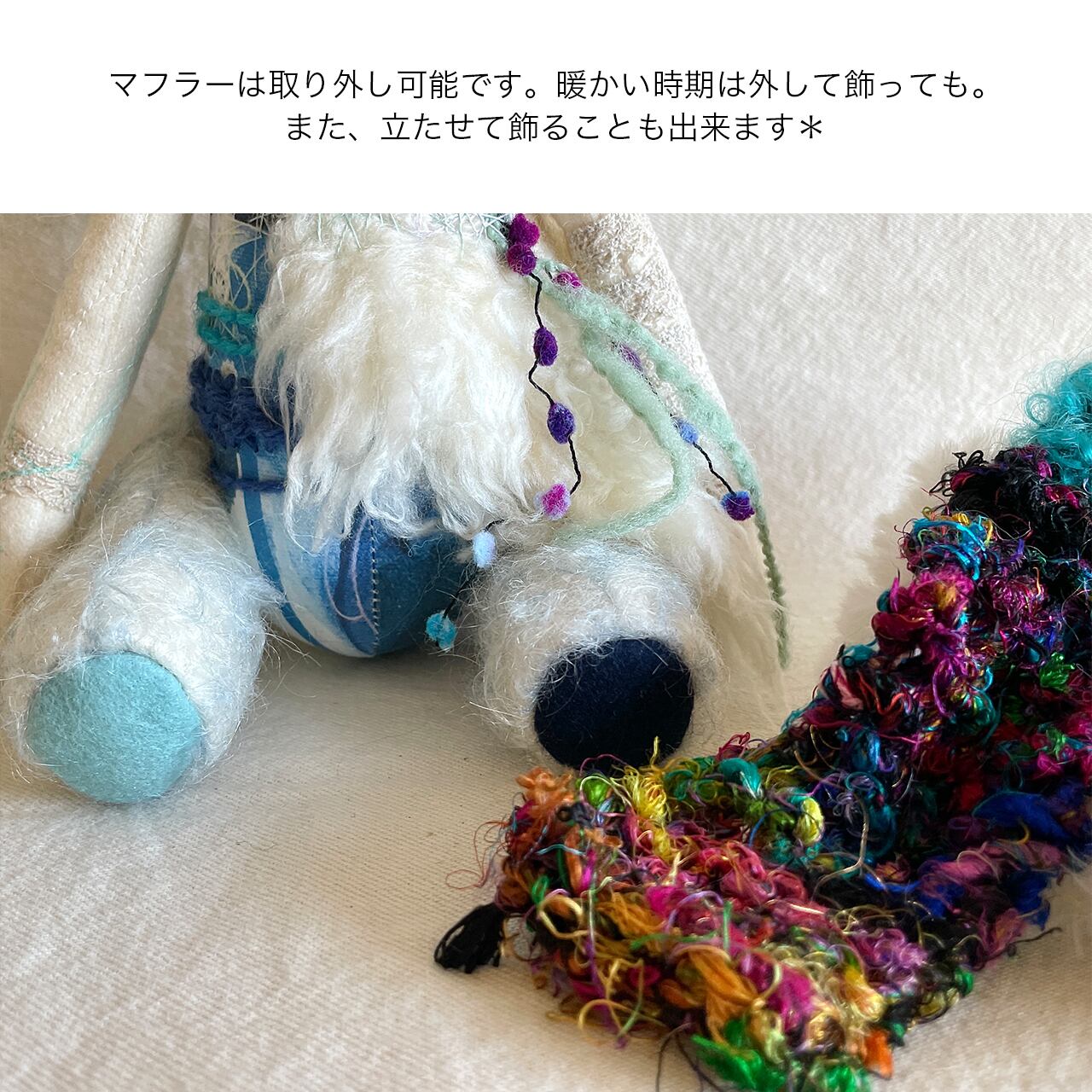 また、マフラー付きですべてひとつひとつ手編みしており、取り外し可能ですので、あたたかい時期にははずして飾っていただくことも出来ます。