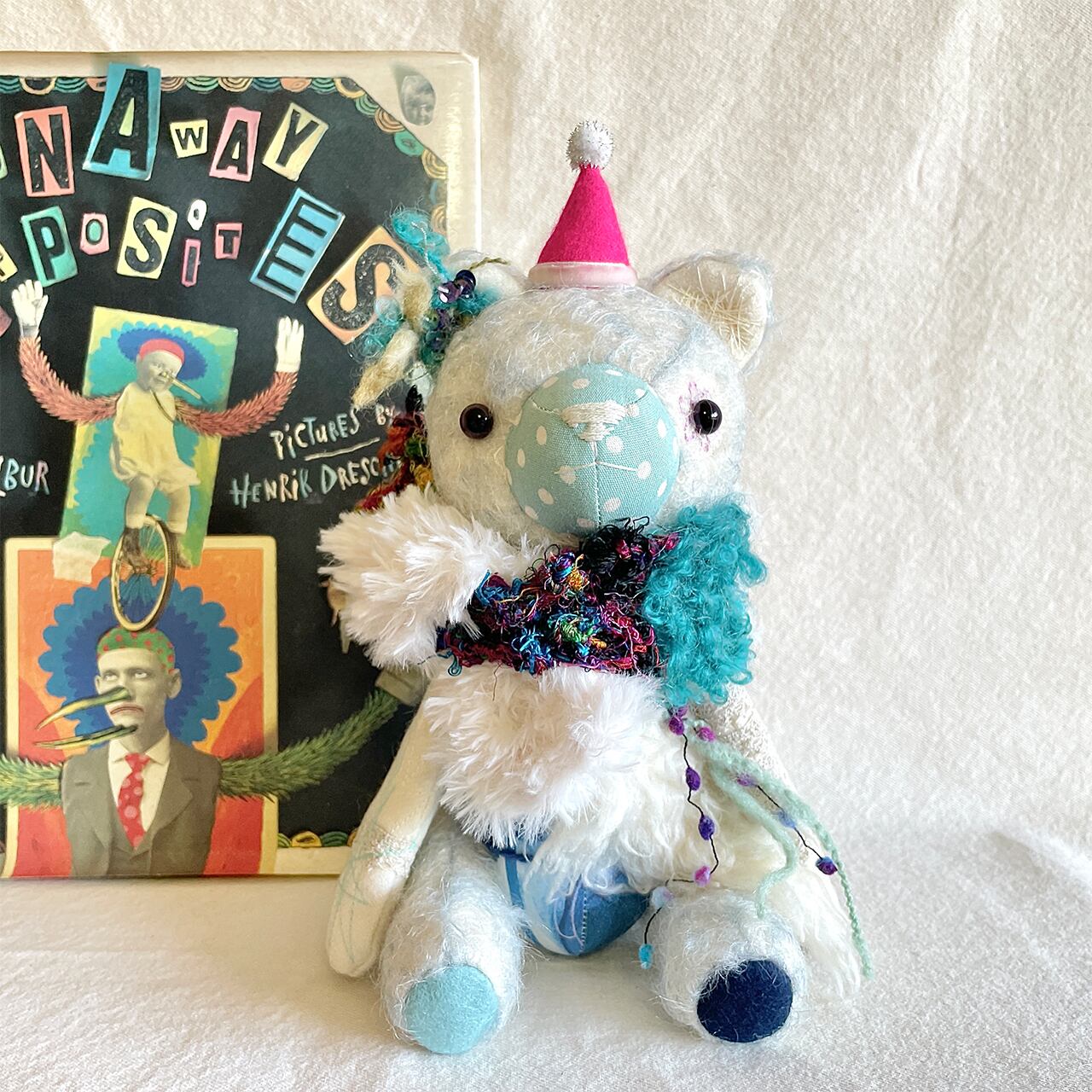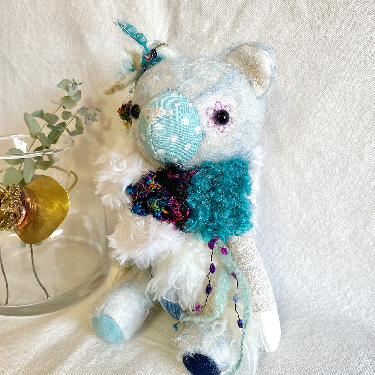 素材 綿生地、モヘア、刺繍糸、毛糸、グラスアイ、アンティークボタンなど
