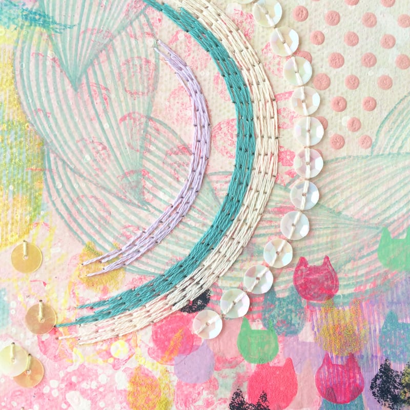 キャンバスに描いた絵に部分的に刺繍を施した作品です。