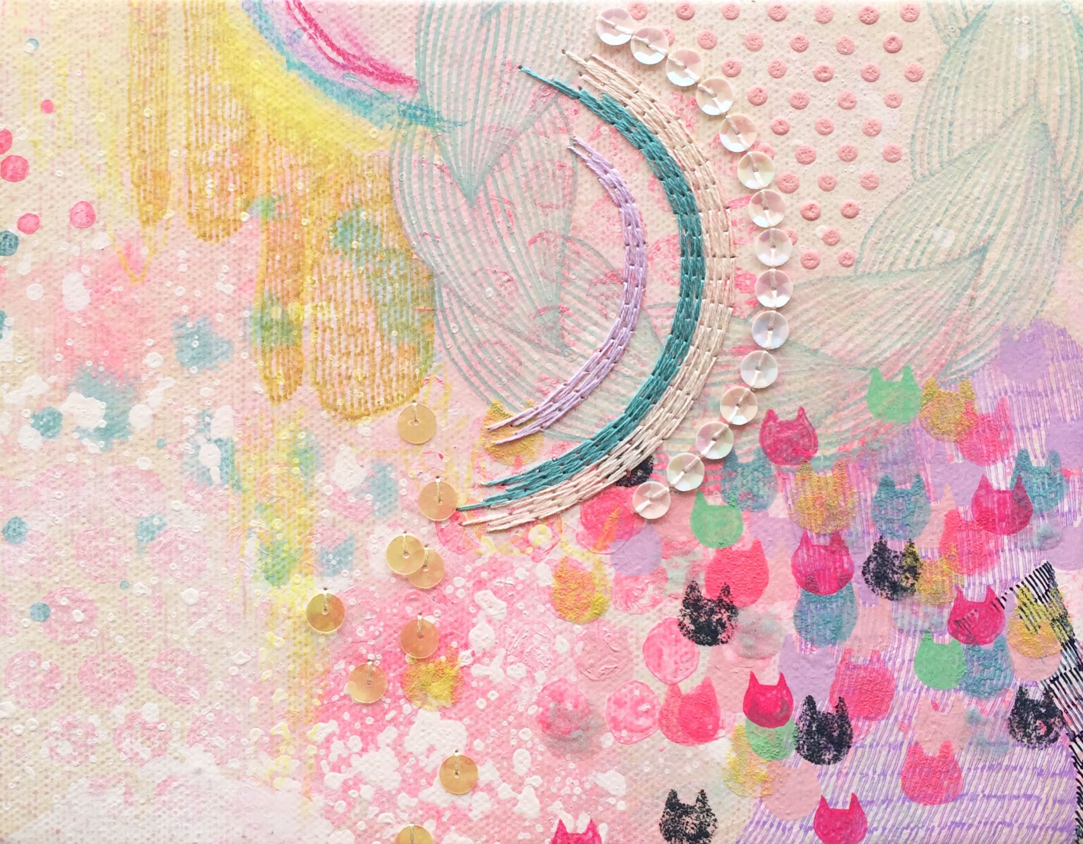 キャンバス、アクリルガッシュ、岩絵具、色鉛筆、刺繍糸、スパンコール