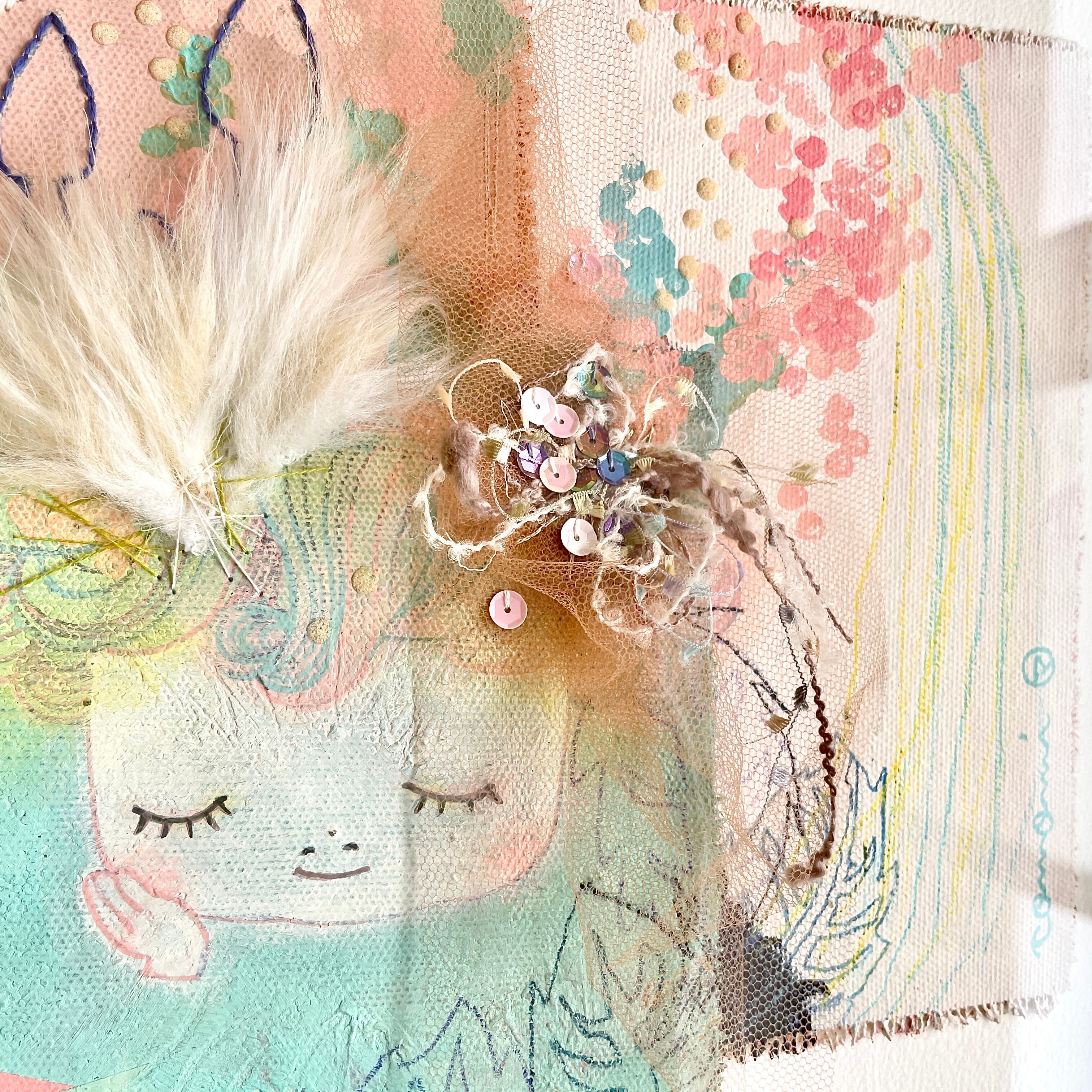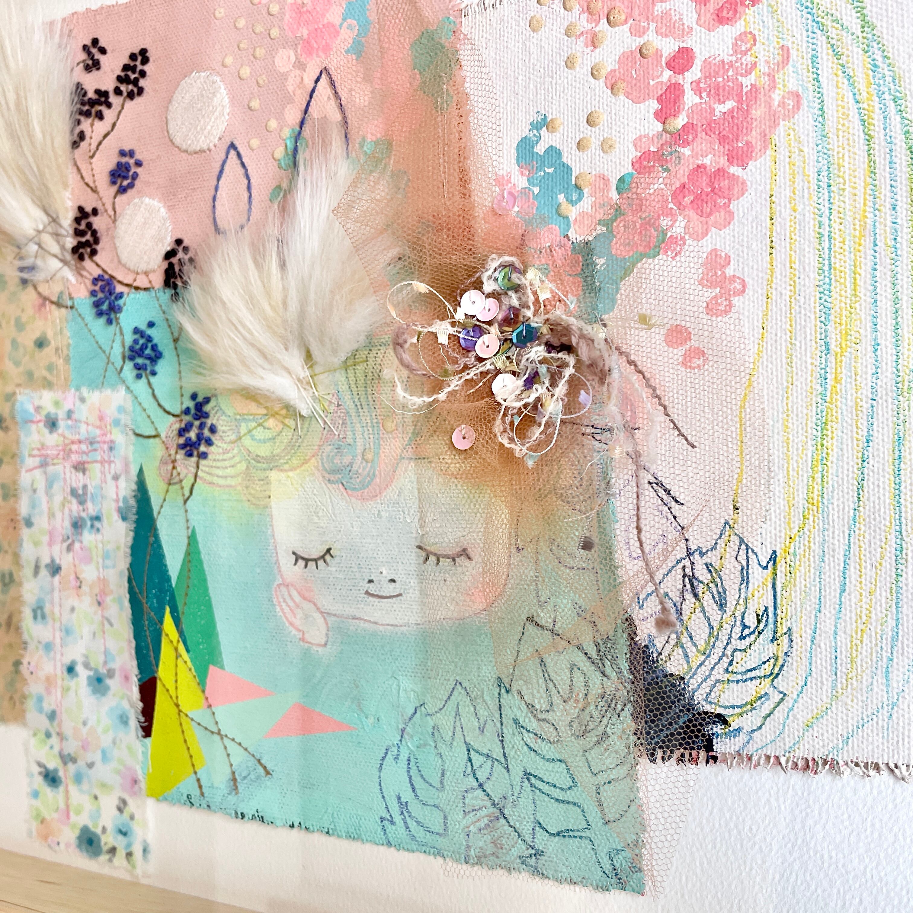 キャンバス、アクリルガッシュ、岩絵の具、色鉛筆、布、刺繍糸、スパンコール、ファー等
