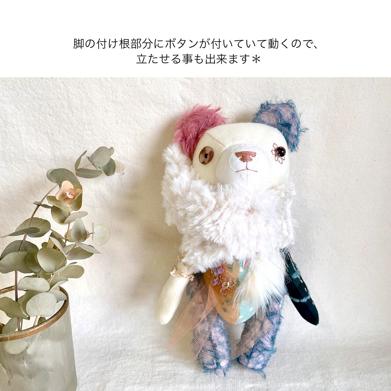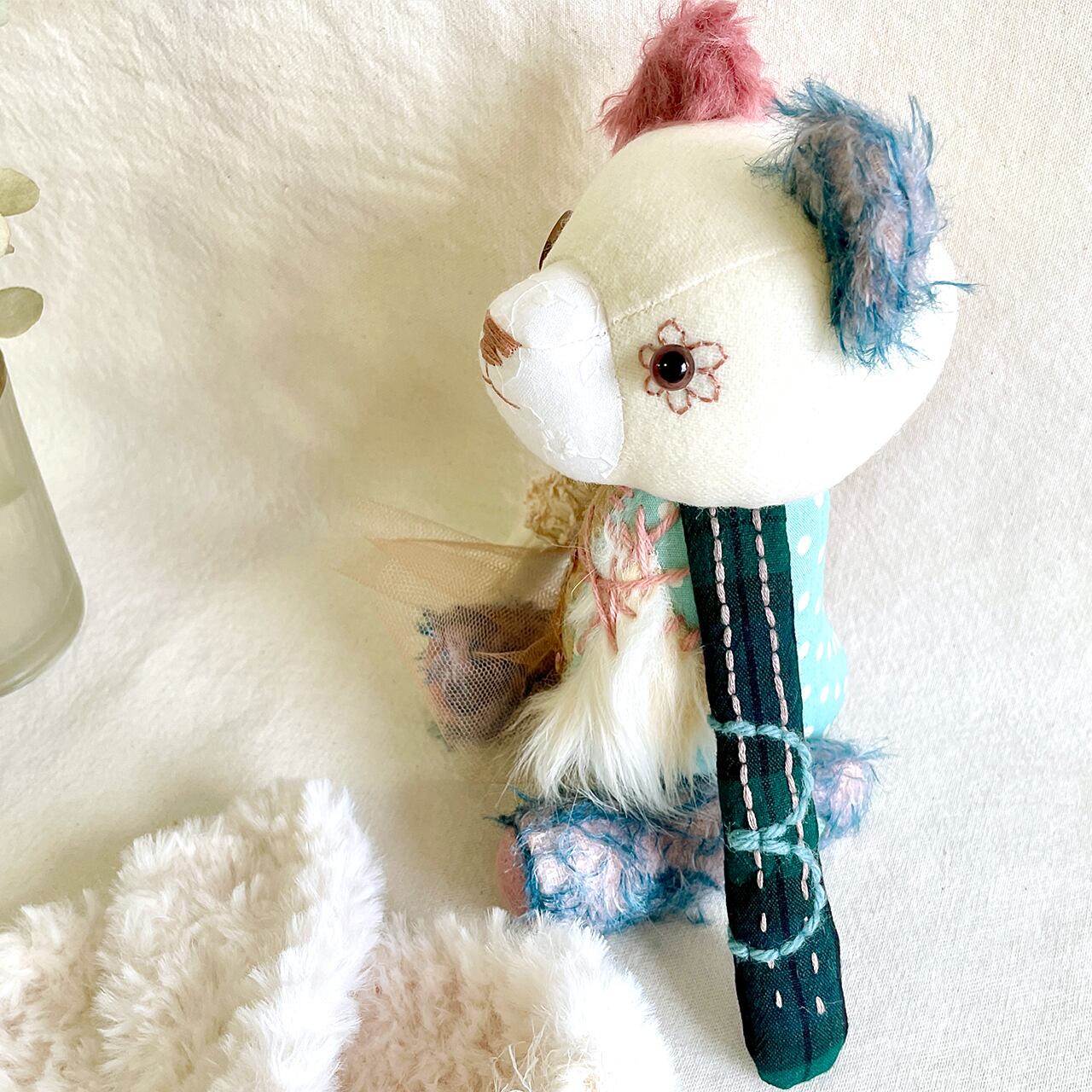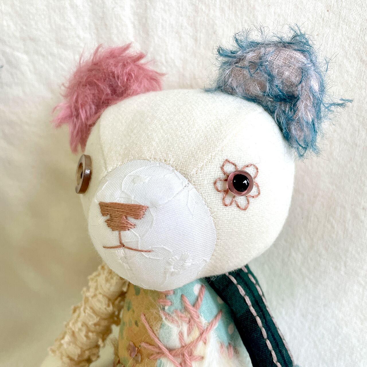 素材 綿生地、モヘア、刺繍糸、毛糸、グラスアイ、アンティークボタンなど