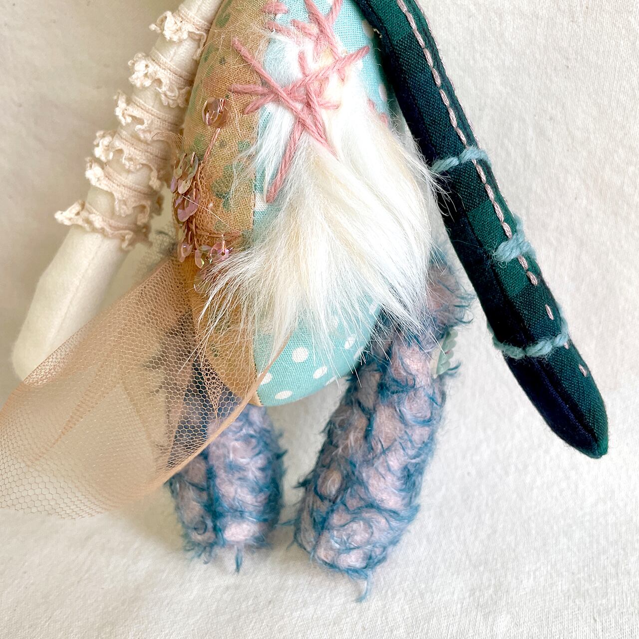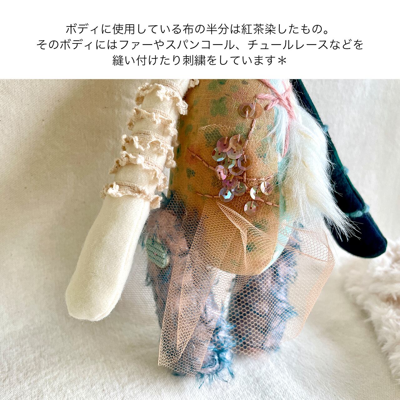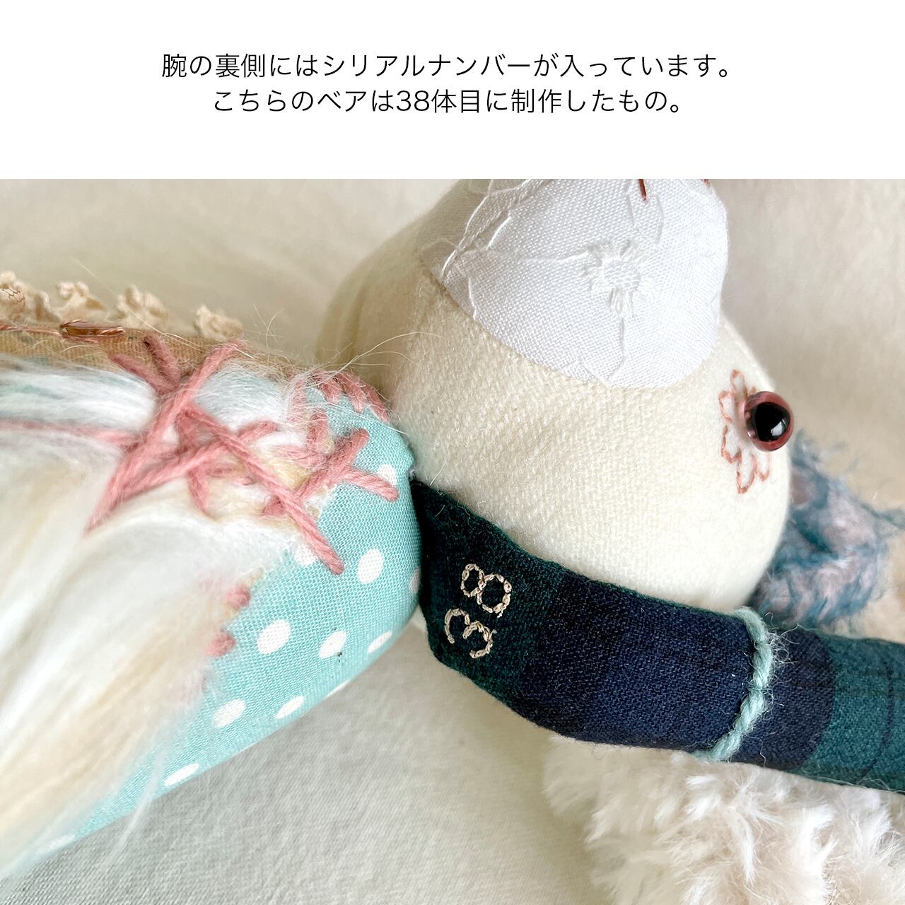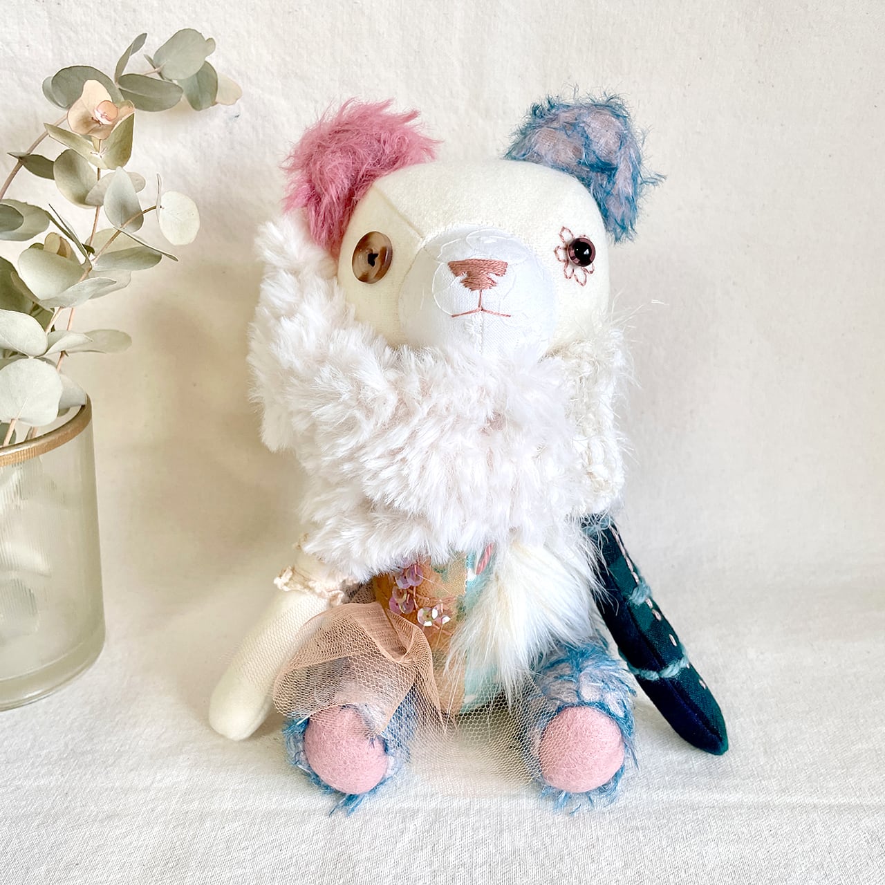 素材 綿生地、モヘア、刺繍糸、毛糸、グラスアイ、アンティークボタンなど
