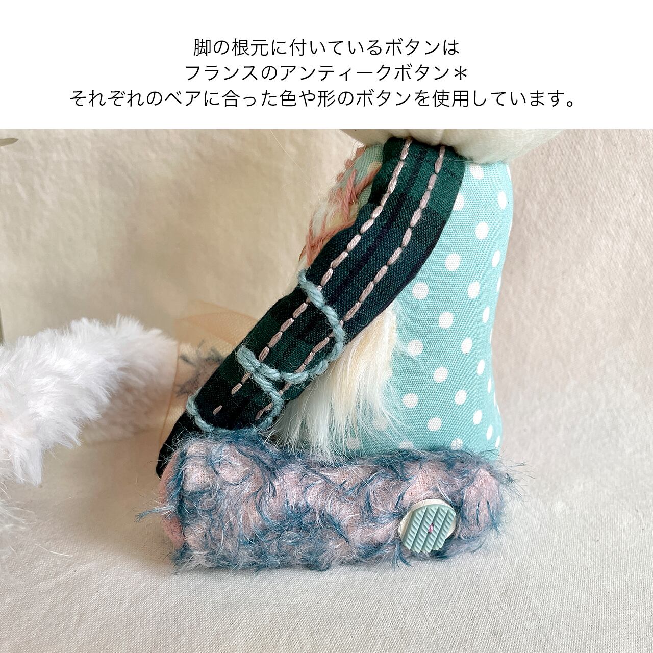 足の付け根の部分のボタンはフランスのアンティークボタン、