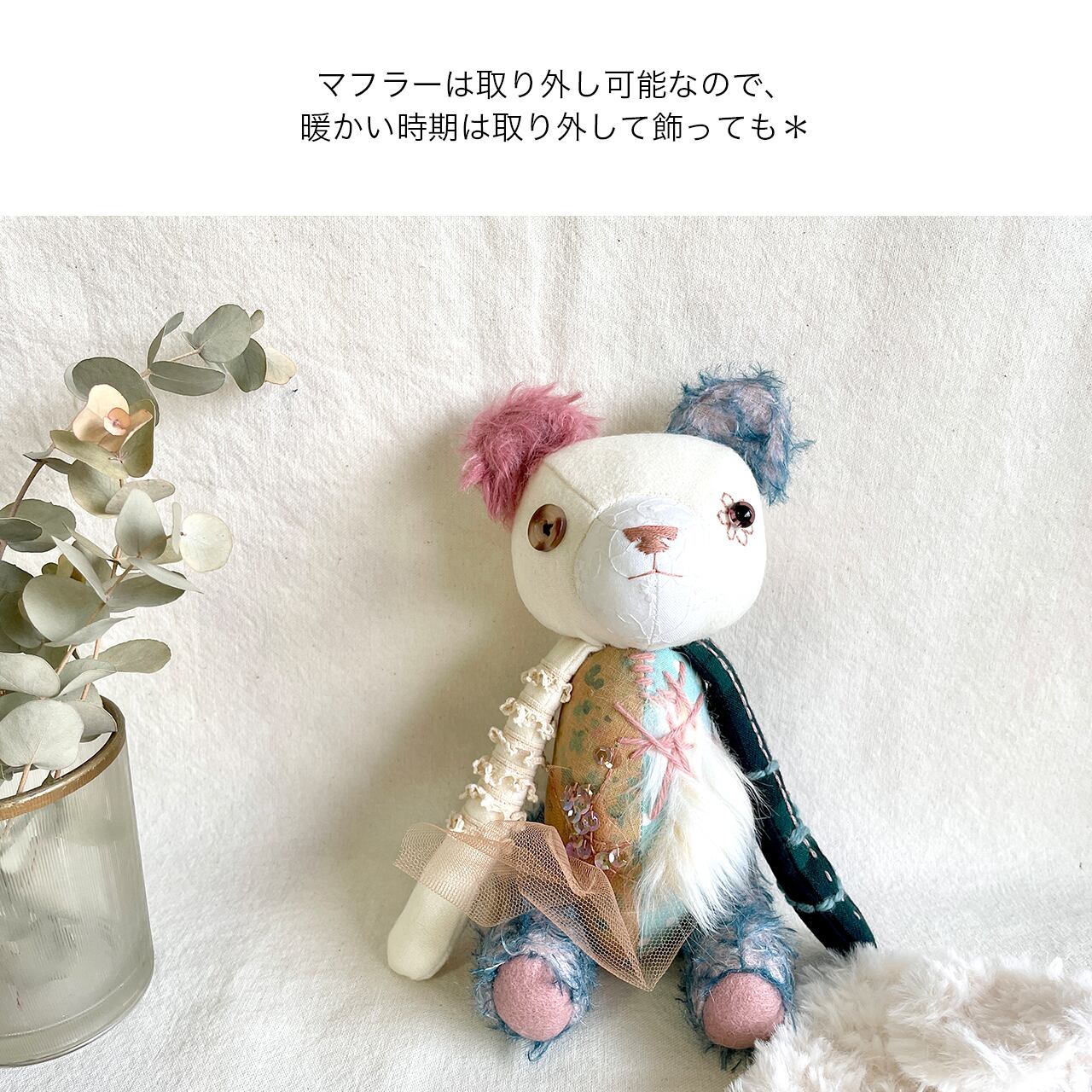また、マフラー付きですべてひとつひとつ手編みしており、取り外し可能ですので、あたたかい時期にははずして飾っていただくことも出来ます。