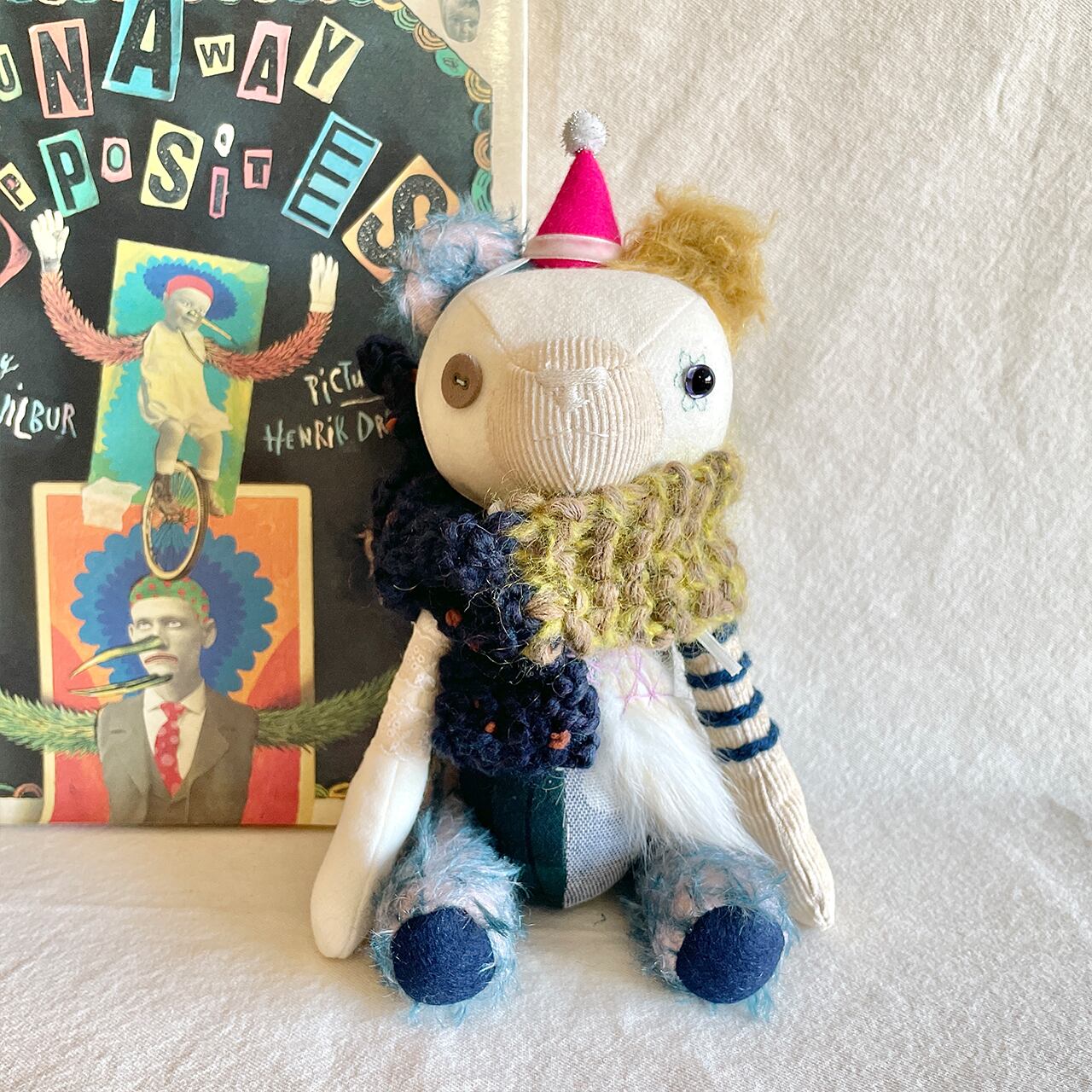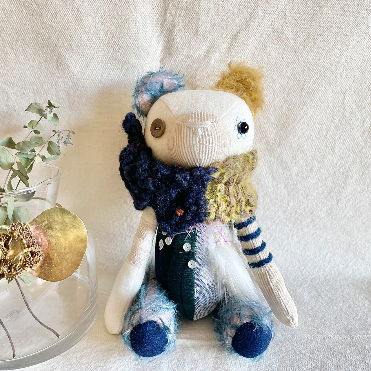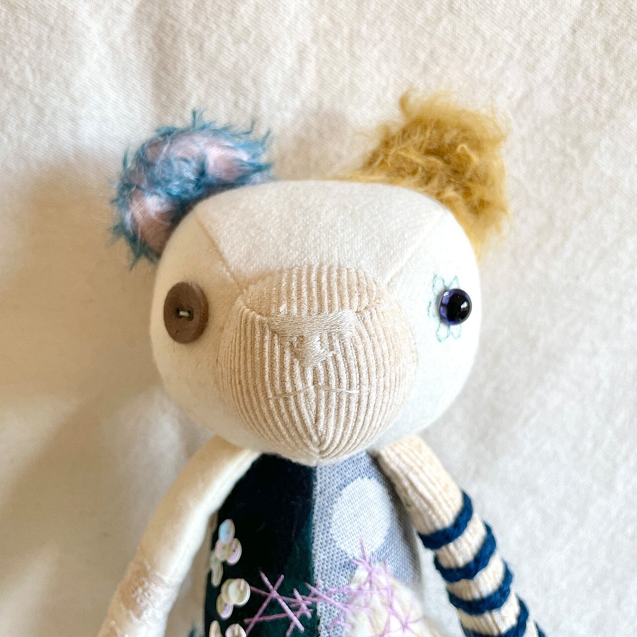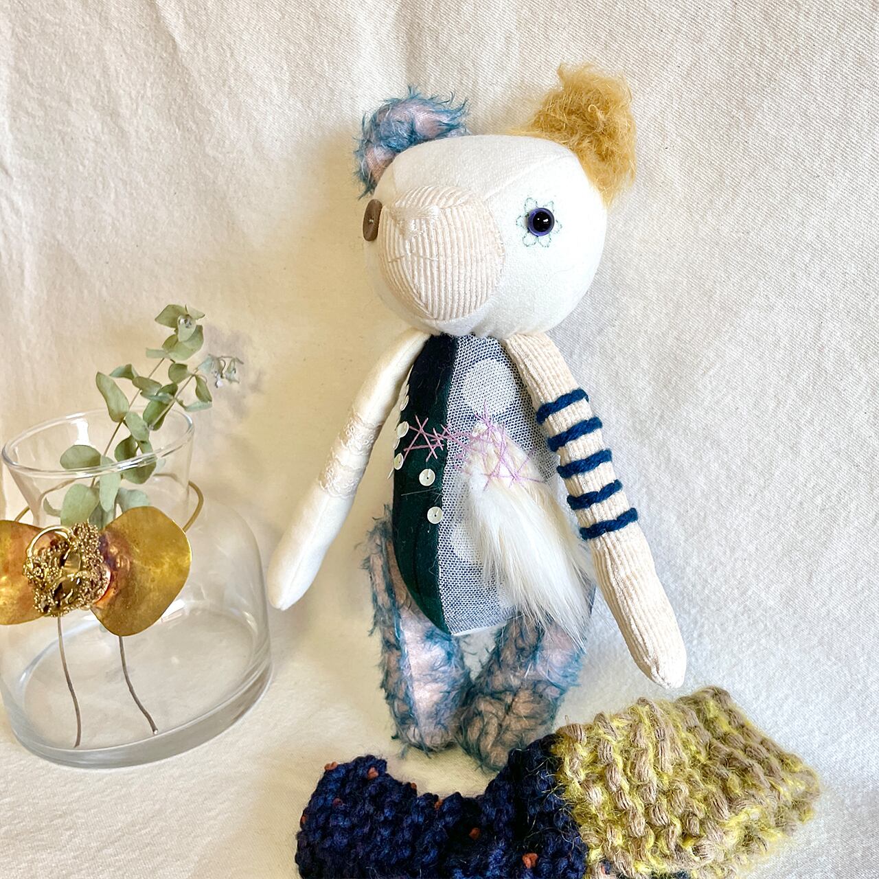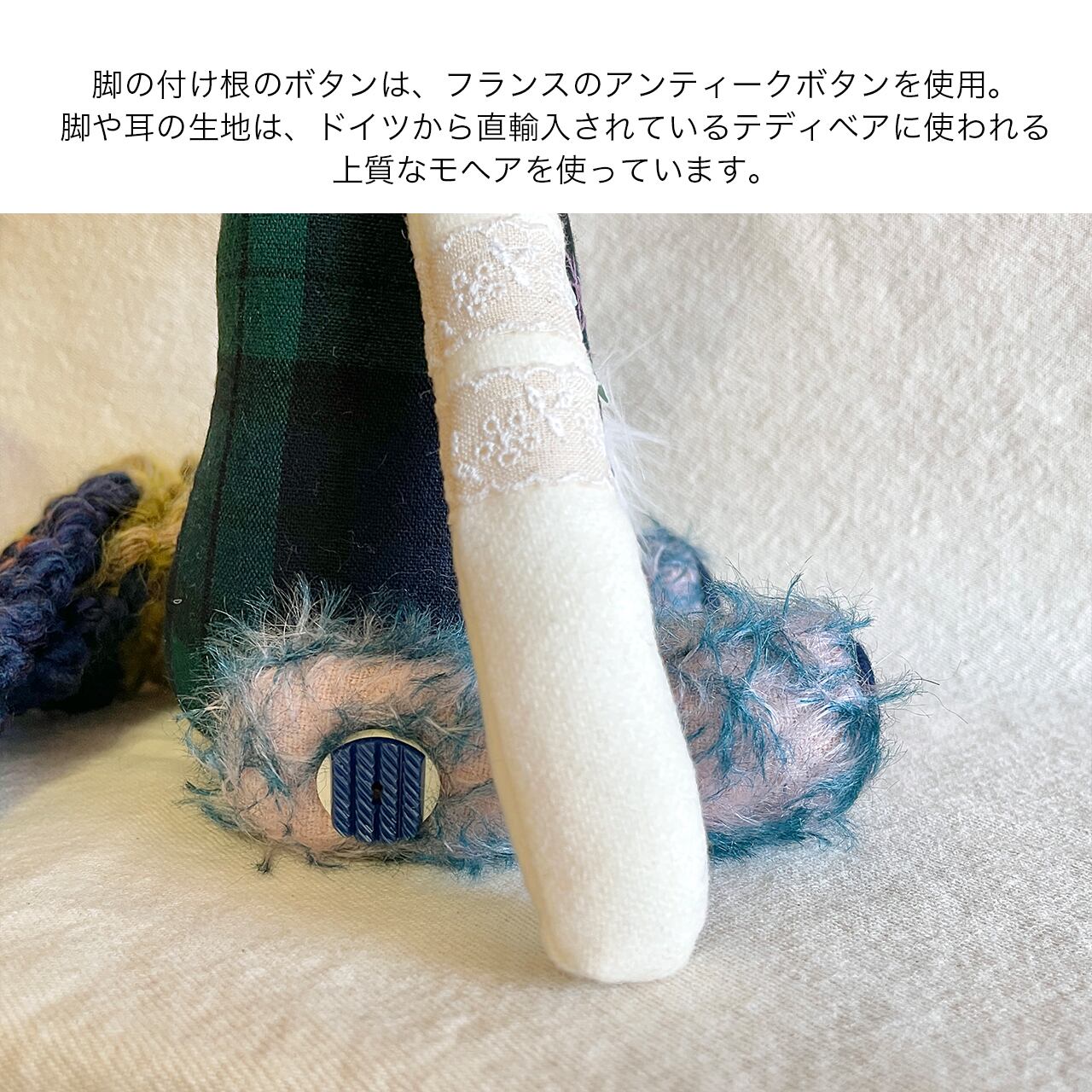 素材 綿生地、モヘア、刺繍糸、毛糸、グラスアイ、アンティークボタンなど