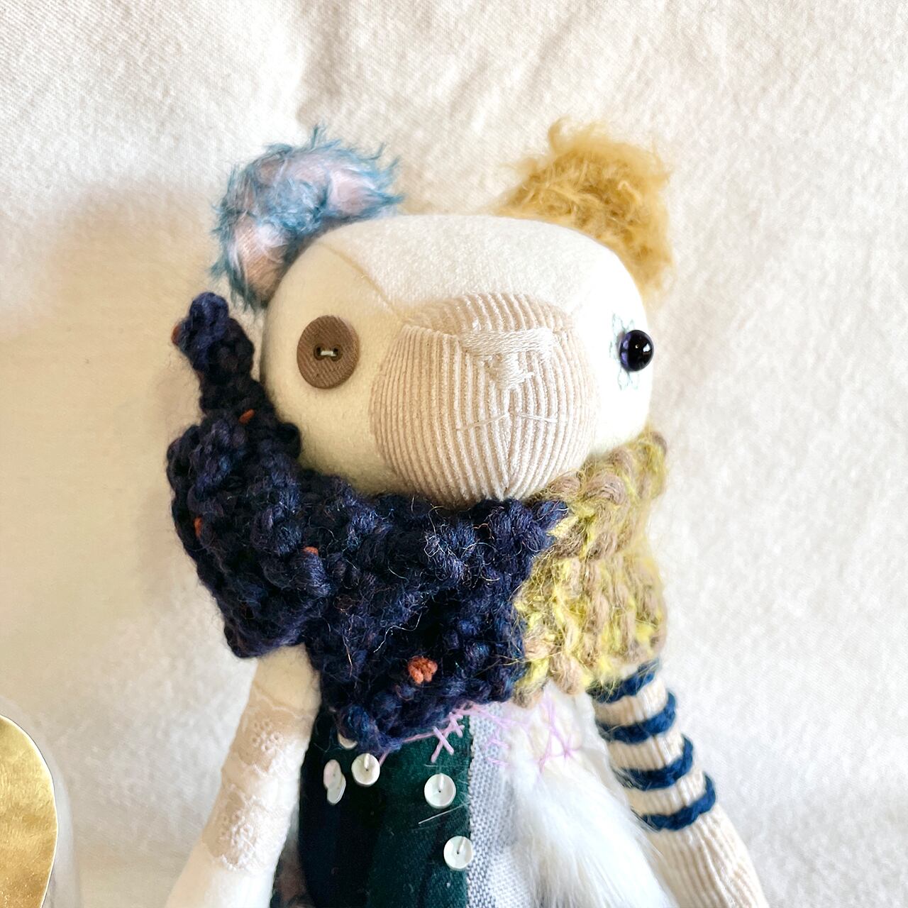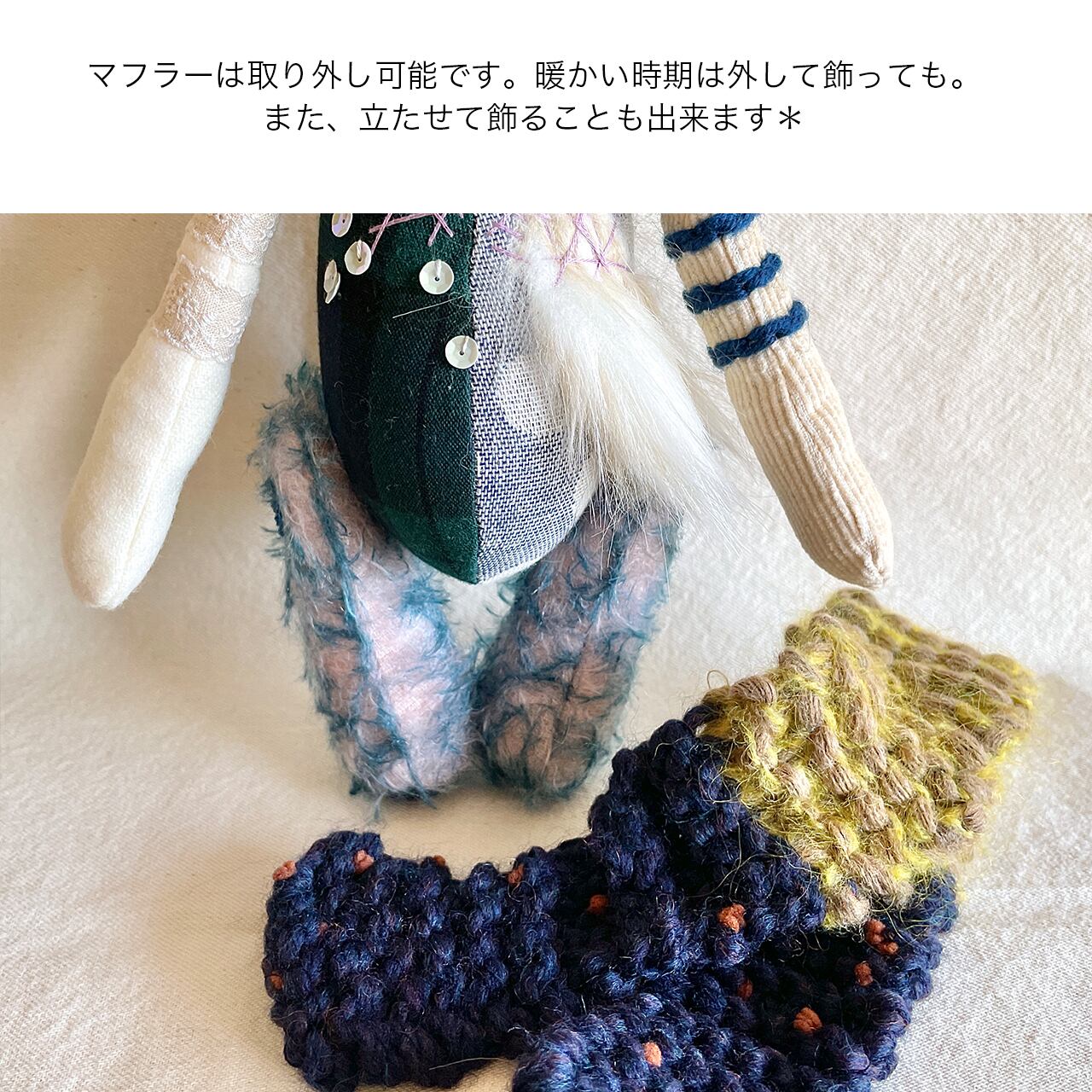 また、マフラー付きですべてひとつひとつ手編みしており、取り外し可能ですので、あたたかい時期にははずして飾っていただくことも出来ます。