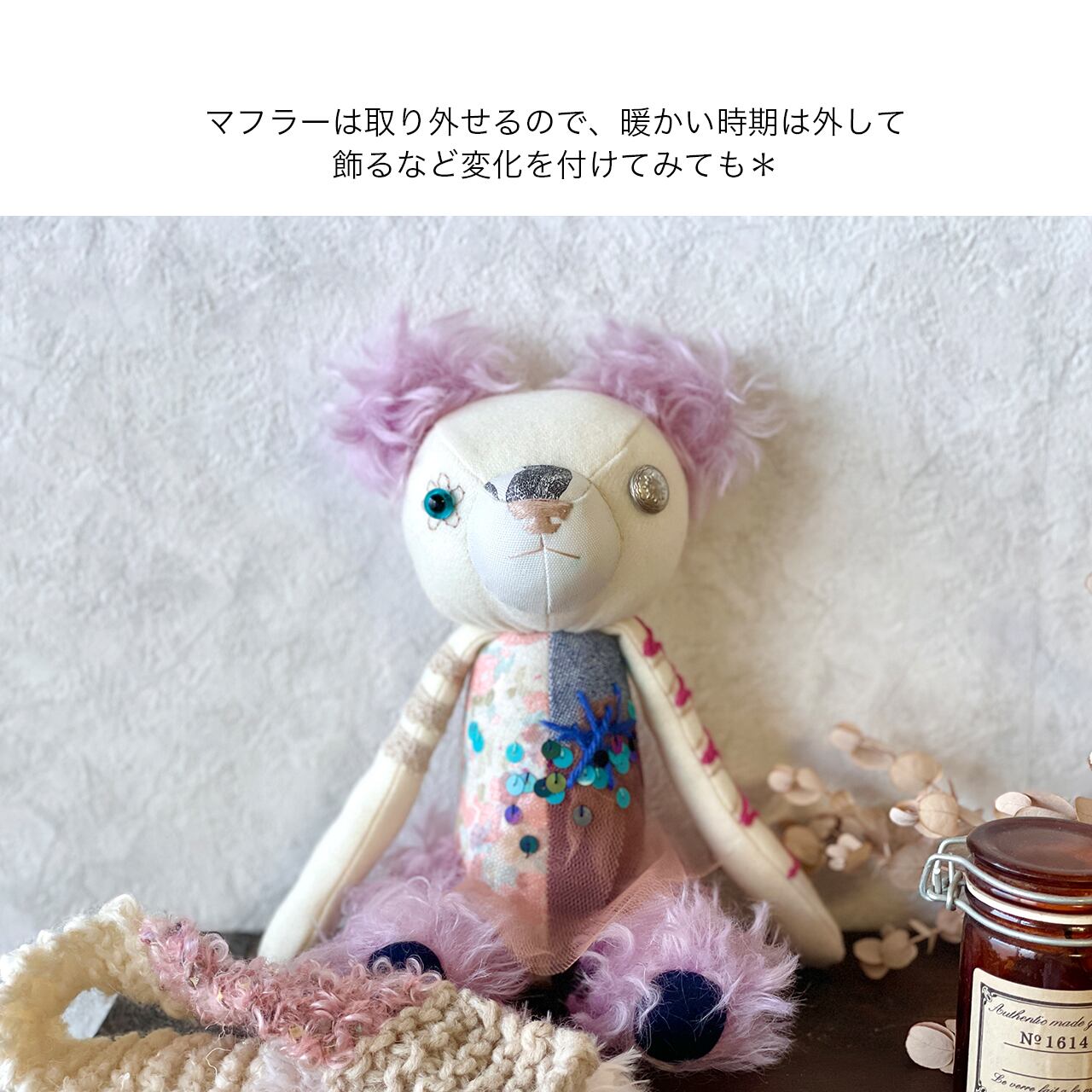 また、マフラー付きですべてひとつひとつ手編みしており、取り外し可能ですので、あたたかい時期にははずして飾っていただくことも出来ます。