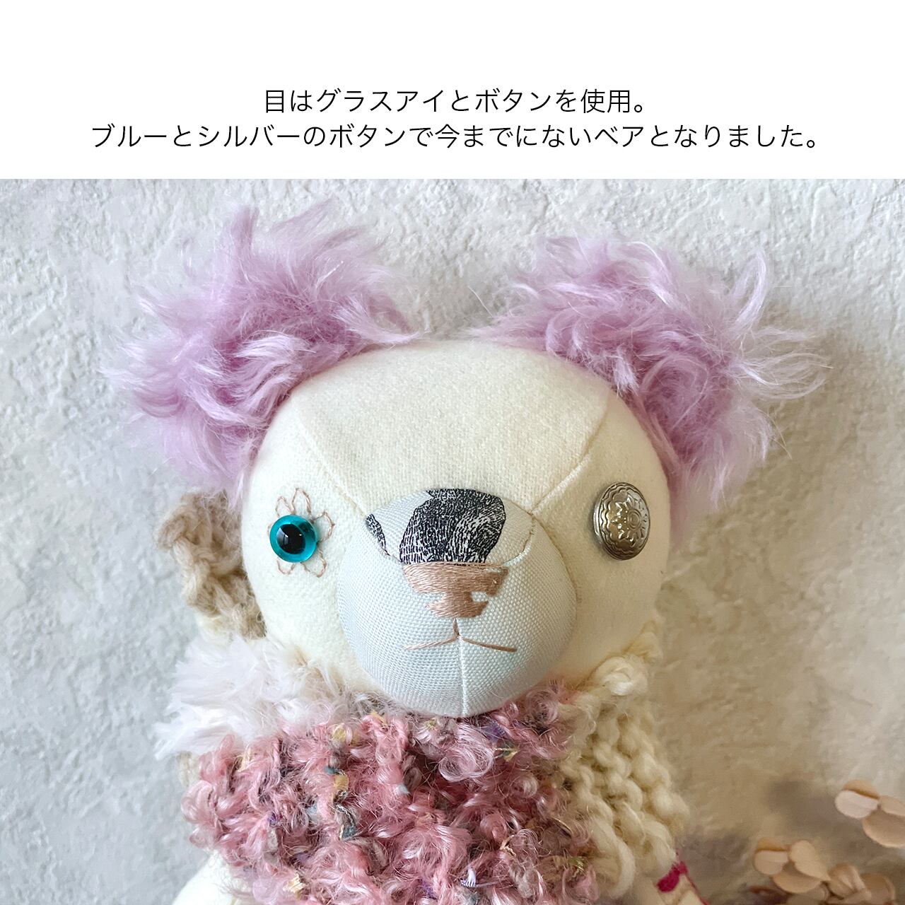 素材 綿生地、モヘア、刺繍糸、毛糸、グラスアイ、アンティークボタンなど